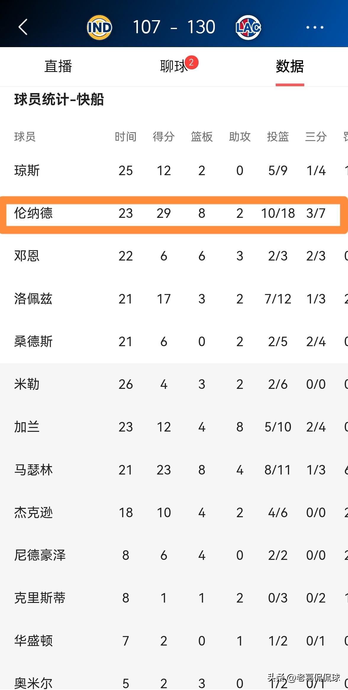 快船巨星伦纳德真是无可阻挡!在今天快船主场以130:107大胜步行者的比赛中,伦纳德展现出了无解的进攻能力,无论他面对什么样的防守,他都能将球放进篮筐。 全场比赛下来,伦纳德仅仅首发出战23分钟,投篮18中10,其中三分球7中3、罚球6中6非常高效的砍下29分,还有8篮板2助攻1抢断,没有出现失误,他的场上正负值为+14。 说实话,当伦纳德保持健康的时候,他的得分能力确实非常的恐怖,防守对于他来说形同虚设。