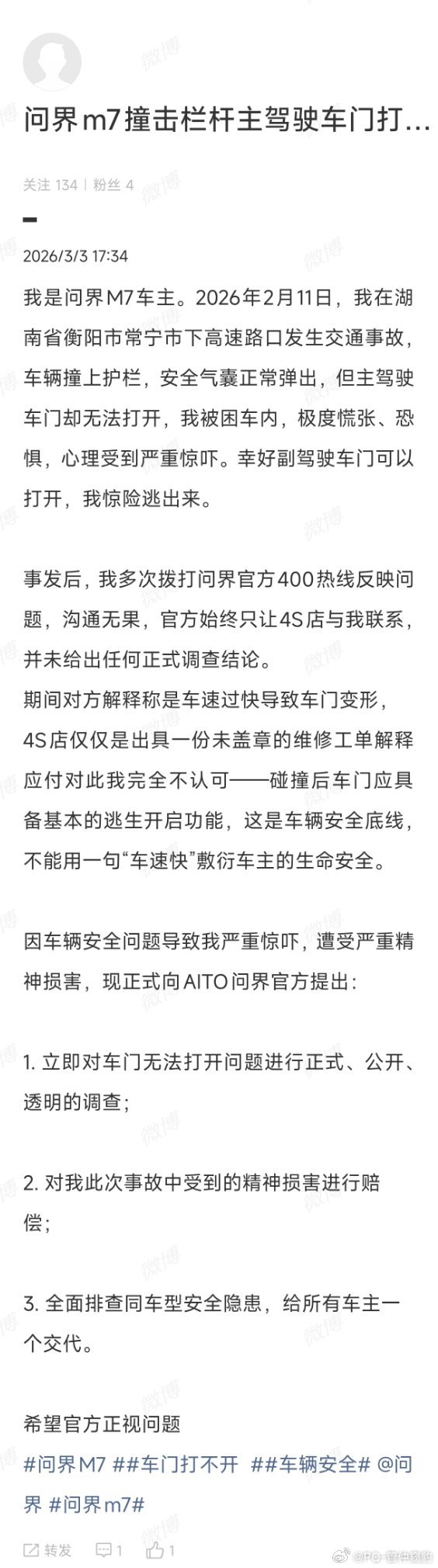 我的观点:【车门变形一般都打不开车门】但是,采用【双区双工艺】车门结构,上半部分用高强度材料抗冲击,下半部分用吸能材料卸力,减少变形卡滞;在连环追尾测试中,即使门框变形,车门仍可通过机械结构开启。几个问题①哪一代问界M7?②高速撞击是多高速度?③撞击角度是什么?④车门打不开?还是开门无法解锁?