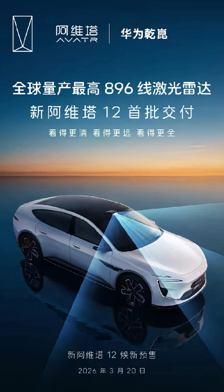 新阿维塔12官宣3月20日开启预售,激光雷达线数从128线直接跳到896线,这是什么概念?相当于手机摄像头从30万像素直接干到1亿像素!这波技术升级直接把智能驾驶卷到新高度。