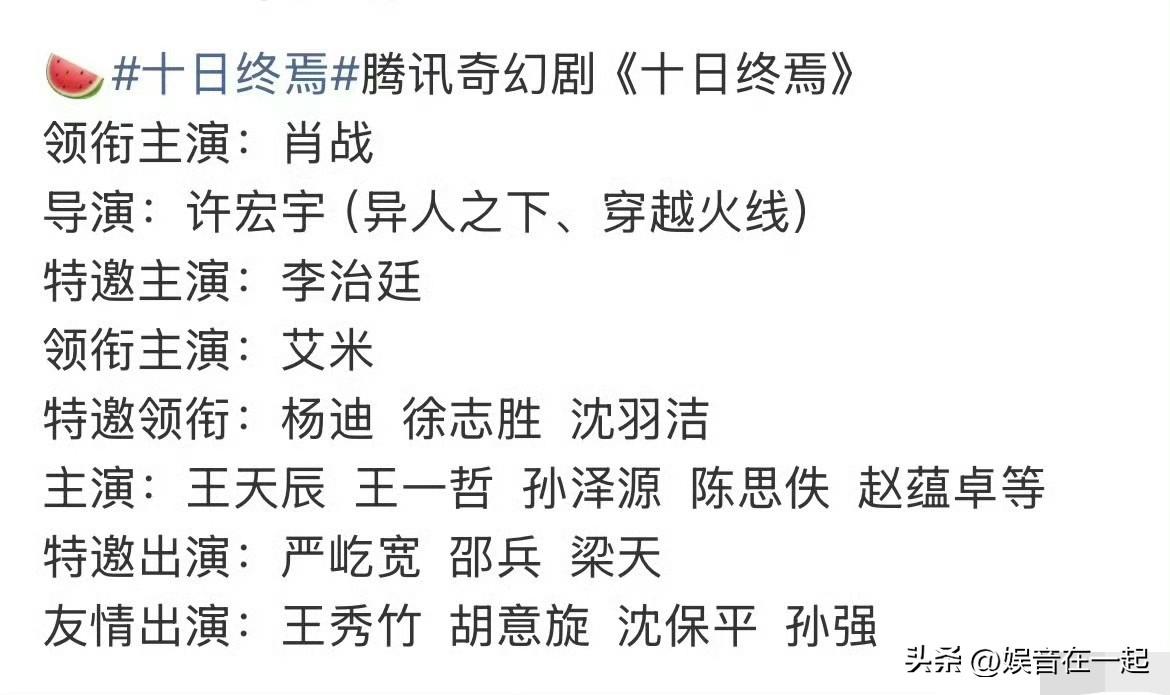 腾讯S+级奇幻大剧《十日终焉》网传主演阵容太意外。领衔主演有肖战、李治廷,还有08后童星艾米。这艾米才17岁,却已有11年戏龄,6岁就出道。她在《催眠·裁决》《长津湖》《云之羽》等剧里都有精彩表现。 这部剧改编自番茄小说高分无限流作品,相关话题播放量破3.5亿,书粉超多。不过网传阵容曝光后争议也有,有人除了肖战其他人不太熟,担心撑不起大IP;也有人觉得有实力派配角和老戏骨,更看重剧情制作。一切等官宣,还是很期待正片! 对于08后童星艾米搭档肖战大家有什么看法呢?