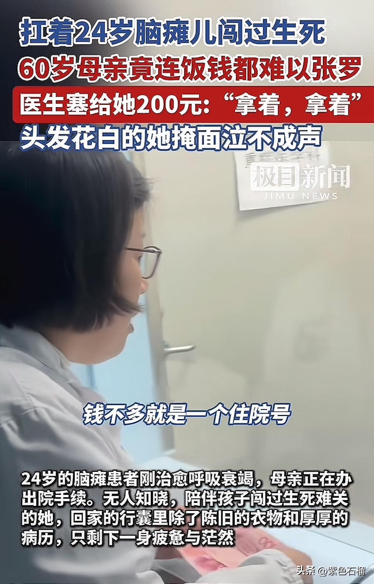 这一幕看哭了所有人! 一位60岁就头发花白的老太太,刚刚让24岁患脑瘫的儿子治愈了呼吸衰竭,正打算办理出院手续。可这时的她的口袋却空空如也。没人知晓,她的行囊中,除了破旧衣物和厚厚的病历,再也掏不出一分钱,就连回家的路费都成了大难题。 这时,儿子的主治医生李爱霞发现,这位母亲竟连一顿饭钱都拿不出,她深受触动!李医生从口袋里掏出200元,对老太太说:“拿着,听话!” 老太太听了医生的这句话,接过这沉甸甸的200块钱,再也抑制不住情绪,掩面痛哭,泣不成声。 真是一文钱难倒英雄汉,没人知道,这二十多年老太太是如何熬过来的。她成了孩子一生的依靠,可自己却为给孩子治病而穷困潦倒,连几十块钱的饭钱都拿不出。 对此,不少网友表示愿意资助这位可怜的老人,尽自己的一份微薄之力。 人间虽有疾苦,但至少还有一丝温暖。希望在众多热心网友的资助下,老奶奶能不再为生计担忧,有更多精力照顾脑瘫儿子。 也希望政府和社会能多关注像老奶奶这样的弱势群体家庭,给予他们更多经济支持,让他们的生存不再那么艰难。 对此,大家有什么想说的?欢迎评论区聊聊。