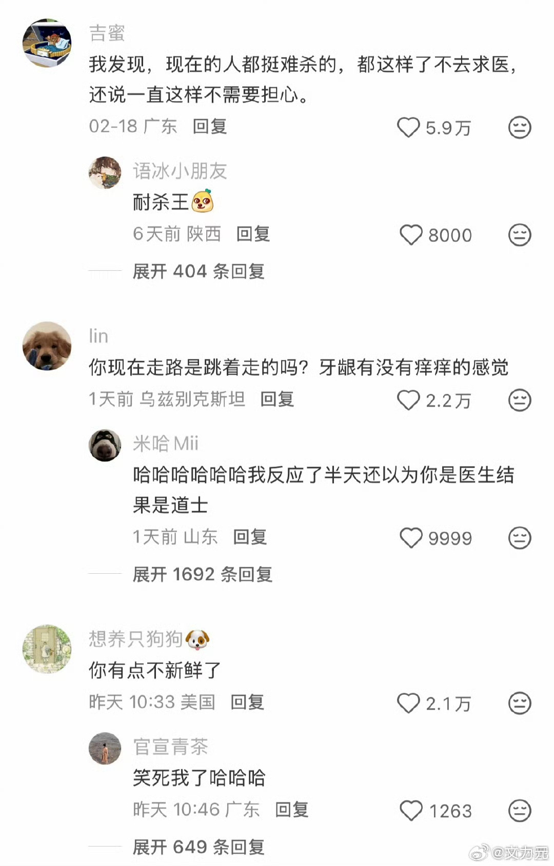 没见过气血虚成这样的《走路是跳着走吗》《牙龈有没有痒痒的感觉》《你有点不新鲜了》好家伙,现在的网友太有才了