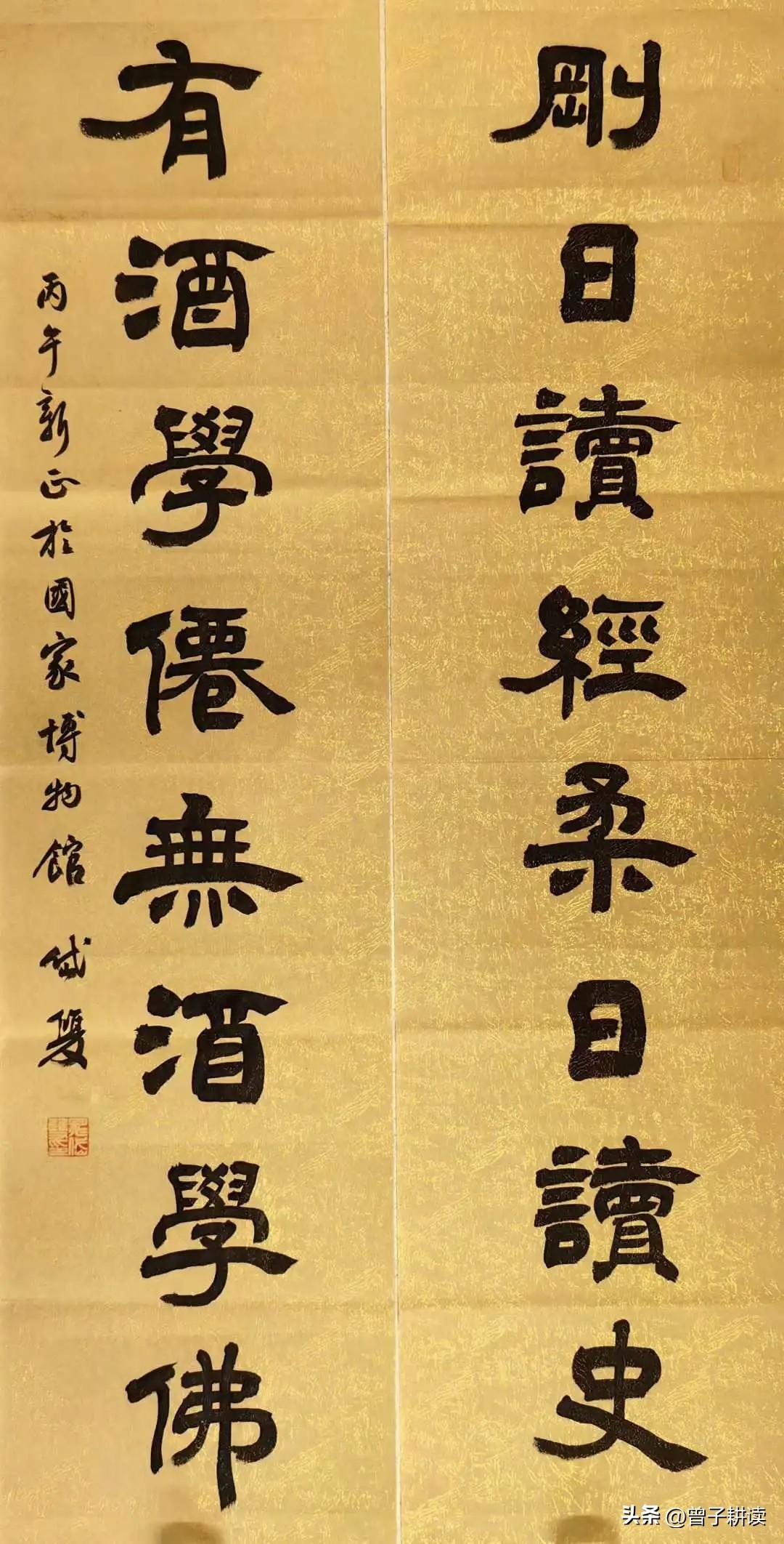 读经读史,学仙学佛 晁岱双博士这幅泥金隶书八言联,落笔即见风骨。“刚日读经,柔日读史;有酒学仙,无酒学佛”,既是清代金缨《格言联璧》的处世箴言,更是笔墨间藏着的千年哲思。 书法上,他以汉隶笔意写就,笔画饱满如锥画沙,结体方正中见灵动,泥金底色衬得墨色沉郁朴拙,尽显大气。“经”“史”二字厚重沉稳,如治学根基;“仙”“佛”二字舒展飘逸,似人生境界。 楹联深意更耐人寻味:刚日读经养浩然正气,柔日读史明古今事理;有酒时放达如仙,无酒时澄心似佛。刚柔相济,进退自如,这不仅是古人的生活美学,更是今人该有的精神底色。