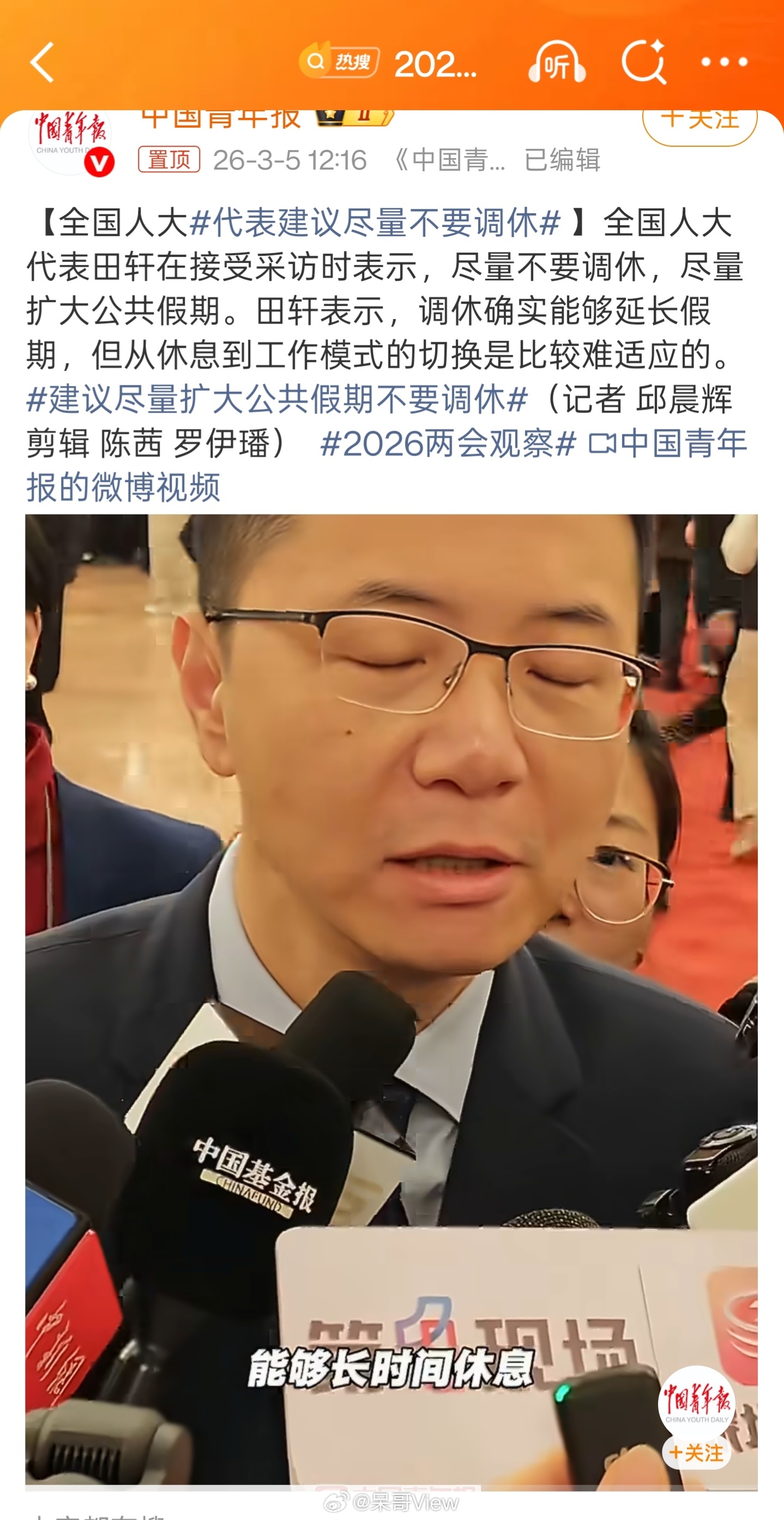田代表简直是打工人的嘴替,拒绝调休,多放真假期,谢谢代表懂我们假后回魂有多难