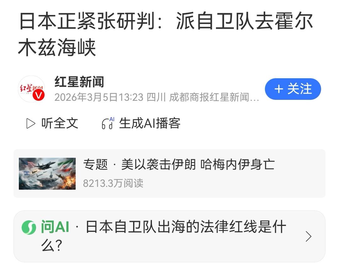 日本终于等到机会了,正加紧研判派自卫队去霍尔木兹海峡执行任务。 这是日本当前正在研判,是否要实施的一项重大的军事行动,也是特朗普提出美国将对通过霍尔木兹海峡的油轮提供护航和保险担保之后,日本突发奇想的又一做法。 一旦日本派出自卫队,既间接的参与了中东战争,又迎合了特朗普的心愿,是首个派兵支持特朗普想法,也是战后首次向海外派出自卫队。 首次即首恶,当前中东战火局势紧张之际,日本趁机参与搅和,一方面为自己拥有军队正名寻找机会,另一方面是谋求军事参与国际事务,为自己赢取声誉而努力。 长期以来,每当国际上有突发事件,日本都会借“危亡存机”的名义弄出新花样,2021年阿富汗美军撤离、塔利班掌权,日本派出空自C-2、C-130共3架和300名中央应急部队前往,结果未获塔利班许可,被困机场4天,仅撤离1名日本人和14名阿富汗人,约500名日侨滞留。 2026年3月,伊朗威胁打击迪莫纳核设施,自卫队运输机正在待命,随时准备出发。 如果说海外撤侨,日本《自卫队法》能够擦点边,但是派兵去霍尔木兹海峡,按照法律一点边都不沾,既没有他国使用武力威胁日本生存,也没有使其国内陷入更大危机,派兵其认定需要通过内阁会议决定及国会批准。 不怕贼偷就怕贼惦记,日本野心已经暴露,恐会随着战局进一步恶化,寻找理由介入中东,这是日本人的劣根。