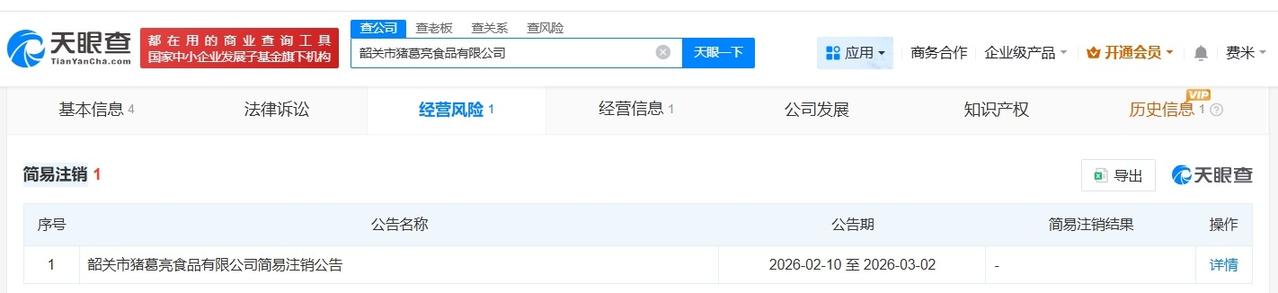 周瑜名下猪葛亮食品公司注销 韶关猪葛亮食品公司注销 天眼查App显示,近日,韶关市猪葛亮食品有限公司登记状态由存续变更为注销。此前,该公司已发布简易注销公告。 韶关市猪葛亮食品有限公司成立于2025年5月,法定代表人为周瑜,注册资本200万人民币,经营范围包括农业专业及辅助性活动、智能农业管理、初级农产品收购等。股东信息显示,该公司由东莞市亿亮食品有限公司全资持股。 天眼查信息: