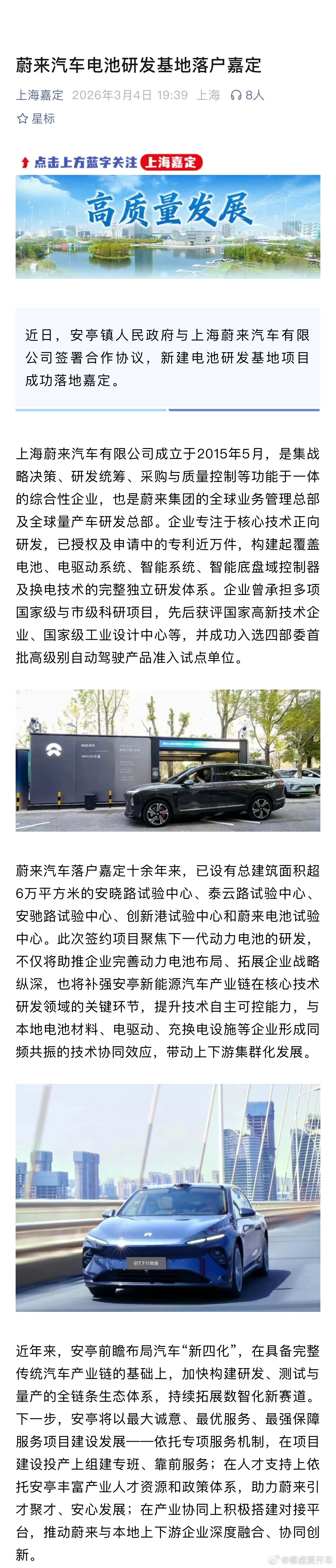 蔚来电池研发基地项目将落地嘉定安亭,一系列动作来看蔚来自研电池还在推进,而电池业务更重要的生产制造还未官宣,大家觉得会和电池公司合作还是搞自产?蔚来动力电池