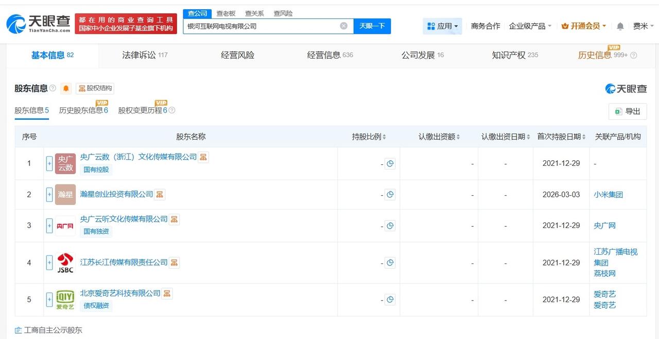 小米旗下瀚星创投入股银河互联网电视公司 天眼查工商信息显示,近日,银河互联网电视有限公司发生工商变更,原股东鹏博士创云(北京)科技有限公司退出,新增小米旗下瀚星创业投资有限公司为股东,同时多位主要人员发生变更。 银河互联网电视有限公司成立于2012年7月,法定代表人为张军,注册资本约1.78亿人民币,经营范围包括广播电视节目制作经营、第一类增值电信业务、第二类增值电信业务等。股东信息显示,该公司现由央广云听文化传媒有限公司、北京爱奇艺科技有限公司及上述新增股东等共同持股。 天眼查信息: