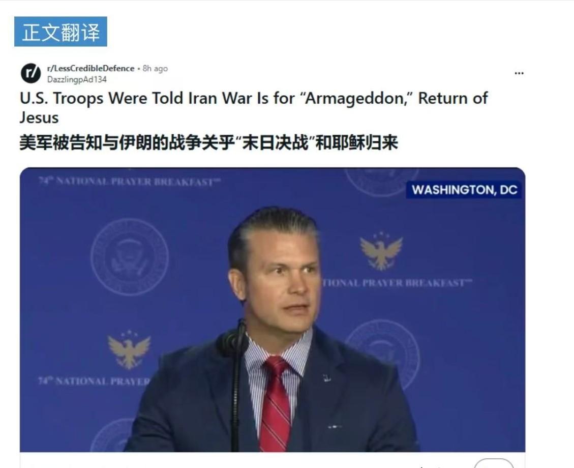 打着“耶稣”的旗号发动侵略战争,西方白皮针对“异教徒”的宗教战争,上千年来从未死心。 如今的美国,更是把这套卑劣伎俩用到极致,彻底撕下文明伪装,露出野蛮底色。美军军官公然向部队灌输荒谬言论,声称轰炸伊朗是“上帝神圣计划的一部分”。美军士兵被反复洗脑,认定与伊朗的战争关乎“末日决战”,关乎耶稣归来。 这种近乎疯癫的偏执,早已脱离正常认知范畴,是无药可救的极端狂热。美国帝国主义与以色列法西斯联手,悍然侵略主权国家伊朗,本质就是一场披着宗教外衣的掠夺战争。 更让人愤慨的是,部分盲目跟风者竟为此欢呼雀跃,全然看不清背后的险恶真相。 这些人甘愿充当西方走狗,出卖祖国利益,却忘了自己在西方宗教狂热者眼里,连基本的人格都得不到尊重。 西方霸权者从未真正接纳异族人,所谓人权自由,不过是他们发动侵略的遮羞布。 作为中国人,我们无需关注西方的宗教闹剧,只需紧盯祖国的核心利益是否受损。 美国早已将中国列为头号战略对手,多年来持续加码对华制裁,不断打压中国发展。 美以联手侵略伊朗,表面是宗教与地缘博弈,实则紧盯中东石油命脉,妄图掐断中国的能源进口通道。 美国的险恶用心,从来都不是单纯针对伊朗,而是想通过掌控中东能源,遏制中国的崛起步伐。 美军借宗教名义发动战争,从来都不是首例,历史早已留下无数血淋淋的罪证。 2003年,美国以虚假的“洗衣粉”证据为借口,悍然发动伊拉克战争,给伊拉克民众带来灭顶之灾。 这场战争导致超20万平民死亡,数百万民众流离失所,伊拉克境内满目疮痍,至今未能恢复元气。 美军在伊拉克无差别轰炸居民区,滥用白磷弹、贫铀弹,犯下的反人类罪行罄竹难书。 2005年,驻阿富汗美军公然焚烧塔利班武装人员尸体,严重亵渎伊斯兰教信仰,引发全球谴责 2012年,美军更是肆意焚烧《古兰经》,激起阿富汗全境反美浪潮,无数民众上街抗议暴行。 美国一边标榜宗教自由、人权至上,一边肆意践踏他国信仰,残害无辜平民,虚伪面目暴露无遗 美军此次给侵伊行动披上宗教外衣,不过是为了麻痹士兵、蛊惑民众,掩盖侵略本质。 士兵被洗脑成宗教狂热分子,便会毫无顾忌地发动屠杀,沦为美国霸权的杀人工具。 美国政客则借着“神圣使命”的幌子,向国内民众兜售战争,转移国内经济通胀、社会矛盾的焦点。 这场战争的本质,从来不是宗教对决,而是美国为了掠夺石油、掌控中东、围堵中国