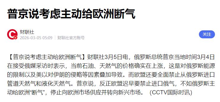 快讯!普京,重大宣布 当地时间3月4日,中东冲突愈演愈烈的关键节点,俄罗斯总统普京对外发表重磅表态。普京针对全球能源价格、俄欧能源关系等核心议题,给出了清晰且强硬的回应。普京直言当下国际石油、天然气价格持续走高,并非单一因素催生的结果。 多重负面因素叠加共振,才推高了全球能源市场的整体价格。普京同时释放重磅信号,俄方正在考虑主动切断对欧洲的天然气供应。普京也再次强调,俄罗斯始终是全球范围内靠谱可信的能源供应国。 这三项表态看似独立,实则环环相扣。每一项表态背后,都有清晰的现实背景与深层战略考量。 这是俄罗斯在复杂地缘博弈与动荡能源格局下,被逼做出的务实且坚定的选择。全球油气价格一路飙升,外界总将原因简单归咎于供应短缺。 普京的表态戳破了这一虚假论调,点明了问题的核心症结。欧盟多年来持续加码对俄罗斯能源的限制措施,彻底打乱了正常的能源贸易秩序。2026年1月26日,欧盟27个成员国正式通过法规,敲定全面禁止俄能源进口的时间表。 法规明确要求,2026年底前全面禁止进口俄罗斯液化天然气。2027年9月30日前,彻底停止进口俄罗斯管道天然气,特殊情况最晚延期至当年10月底。这份铁了心要与俄能源脱钩的法案,早在2025年就完成多轮磋商与投票。 欧洲议会以超500票赞成的压倒性结果,通过了这项逐步弃购俄天然气的计划。欧盟的决绝态度,让全球能源市场陷入持续的恐慌与不确定性之中。贸易商不敢轻易签订长期能源合约,跨境能源运输链路频频受阻。 市场供需预期被彻底扭曲,油气价格自然随之水涨船高。紧接着,美以联军对伊朗发起持续侵略行动,进一步加剧了能源市场的动荡。伊朗扼守霍尔木兹海峡这一全球能源运输咽喉要道。全球超三分之一的海运石油贸易,都要经过这一关键海峡。 美以的军事打击,让中东地区局势彻底失控。霍尔木兹海峡的航运安全面临严重威胁,石油运输随时可能陷入中断。市场对能源供应中断的担忧持续加剧,资本借机炒作抬价。双重压力层层叠加,最终推高了全球石油与天然气的整体价格。 普京精准点破涨价真相,既还原了市场乱象的本源,也道出了俄罗斯的无奈处境。普京提出考虑主动对欧洲断供天然气,绝非一时冲动的威胁。这是俄罗斯面对欧盟步步紧逼,做出的反制性现实抉择。 2025年全年,俄罗斯天然气仅占欧盟天然气进口总量的13%。这份份额看似不高,却是欧洲民众过冬取暖、工业生产运转的关键保障。欧盟一边靠着俄天然气维系民生与工业运转,一边忙着制定禁令、准备彻底断供。 欧盟的做法,既不讲商业信誉,也不顾及欧洲民众的切身利益。欧盟早已打定主意弃购俄天然气,只是碍于过渡期安排,迟迟未彻底撕破脸。俄罗斯自然不会坐等欧盟单方面毁约,更不会任由欧盟拿捏。 普京主动放出断供信号,就是要抢占能源博弈的主动权。俄罗斯不愿再做欧盟的“备用能源仓”,更不愿被欧盟牵着鼻子走。与其等到2027年被欧盟彻底踢出局,不如主动提前断供止损。普京的这一表态,也给欧盟敲响了警钟。 欧盟妄想一边制裁俄罗斯,一边安稳享用俄天然气的日子,早已一去不复返。普京反复强调俄罗斯是可靠能源供应国,更是用事实击碎西方的抹黑造谣。过去数十年间,俄罗斯始终恪守能源供应合约。 即便遭遇西方多轮严厉制裁,俄罗斯也从未主动中断过合法合规的能源供应。俄罗斯依靠完善的能源基础设施,稳定向欧洲、亚洲等多地输送油气资源。俄罗斯用长期稳定的供应表现,赢得了全球合作伙伴的信任。 反观欧盟与美国,才是扰乱全球能源市场的始作俑者。欧盟执意推进脱钩政策,破坏稳定的能源贸易格局。美国四处煽动地区冲突,借能源危机牟取暴利,全然不顾全球民生疾苦。俄罗斯的可靠与西方的自私,形成了极其鲜明的对比。 普京的一系列表态,本质上是俄罗斯捍卫自身能源利益的强硬发声。俄罗斯不愿被卷入西方挑起的地缘乱局,更不愿任由西方收割能源利益。中东战火持续蔓延,欧洲能源禁令步步紧逼。 俄罗斯唯有主动出击,才能守住自身的核心利益与国际信誉。这场围绕能源展开的博弈,早已超出单纯的贸易范畴。普京的表态,既道出了全球能源涨价的真相,也彰显了俄罗斯绝不妥协的底气。 欧盟若执意坚持错误的脱钩政策,最终只会让欧洲民众承受能源短缺、价格飞涨的苦果。俄罗斯始终坚守契约精神,也会坚定维护自身合法权益,无惧任何外部施压与挑衅。