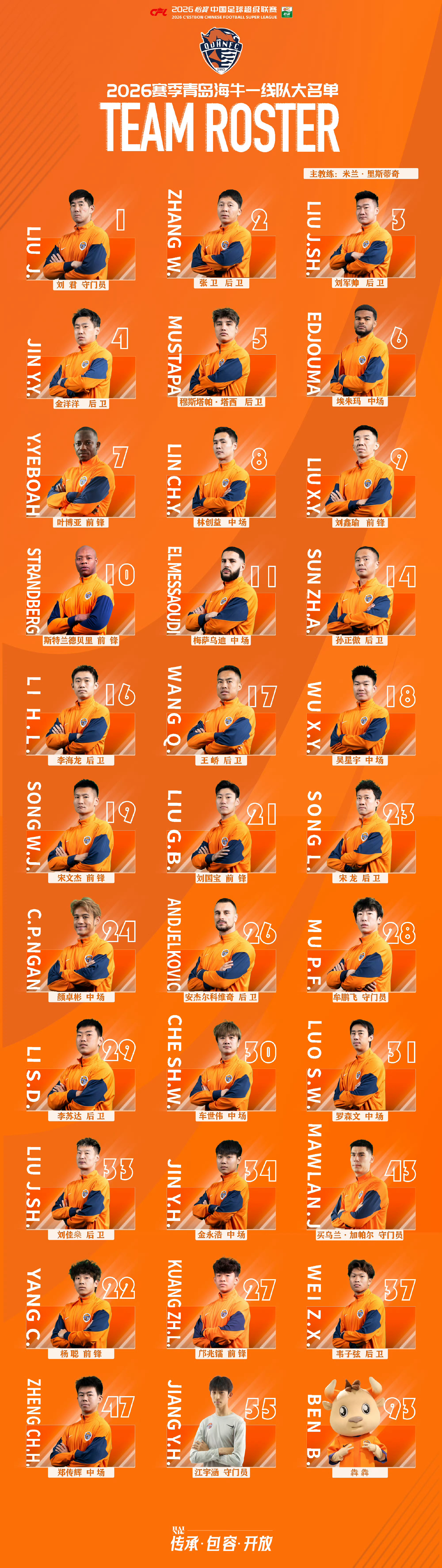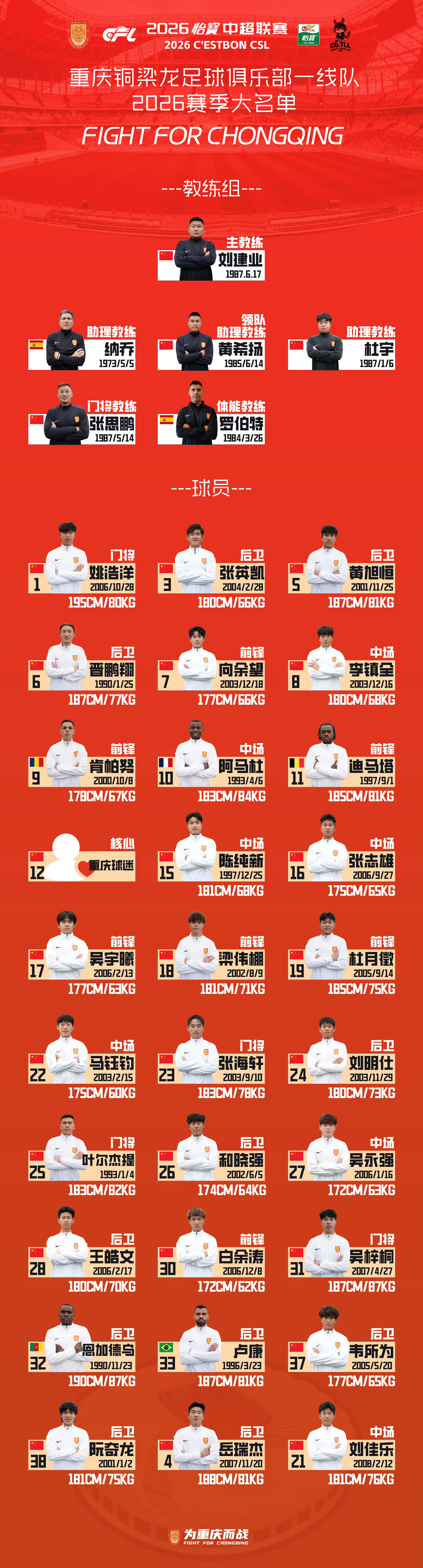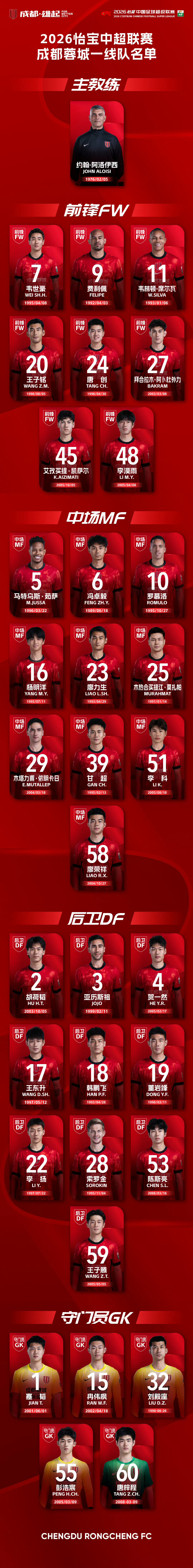 2026赛季中超联赛各队官方版大名单陆续发布。。中超联赛
