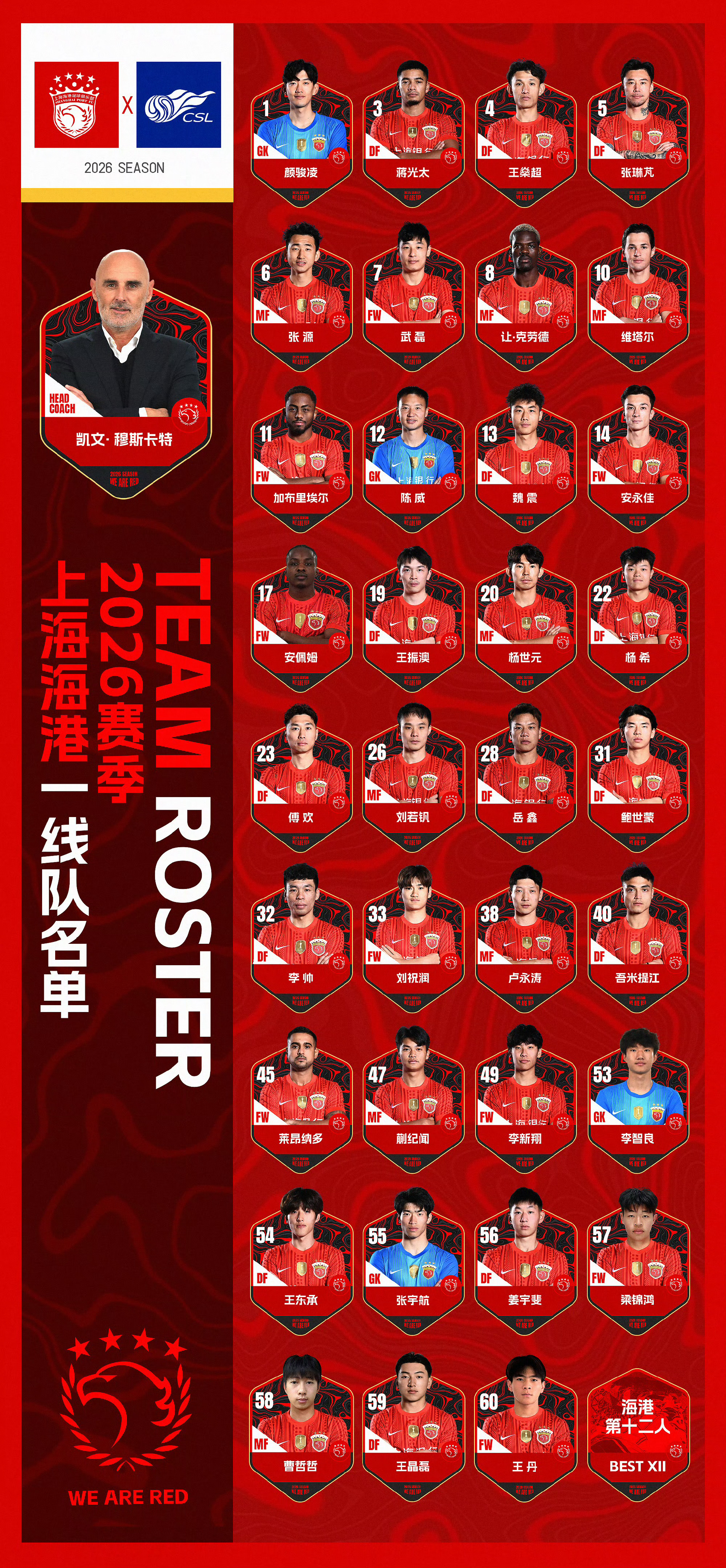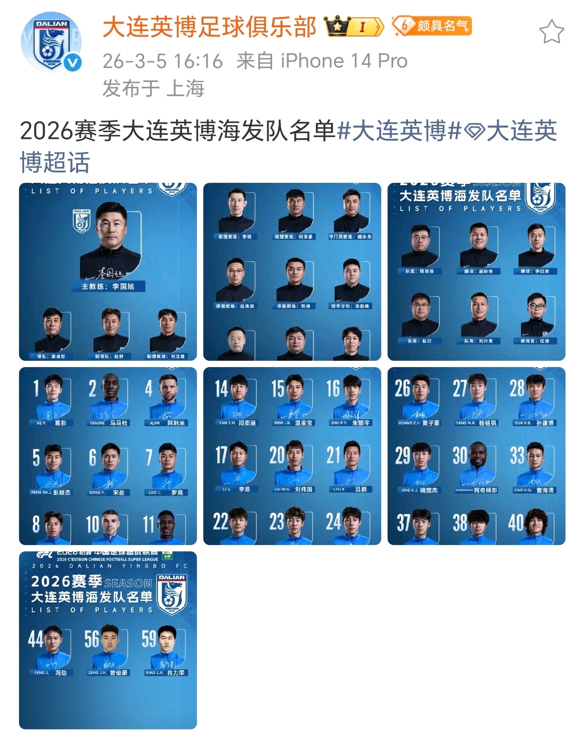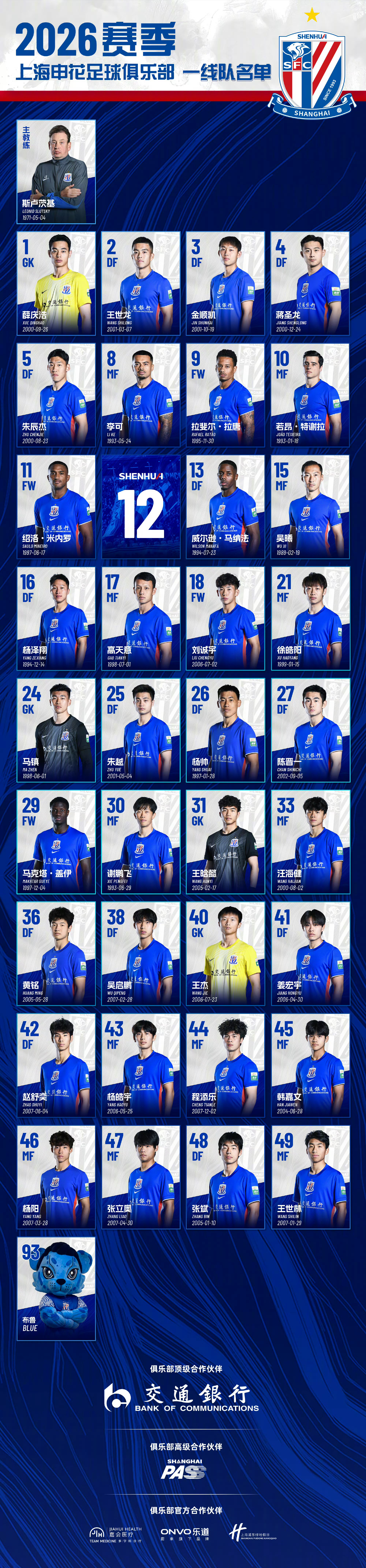 2026赛季中超联赛各队官方版大名单陆续发布。。中超联赛