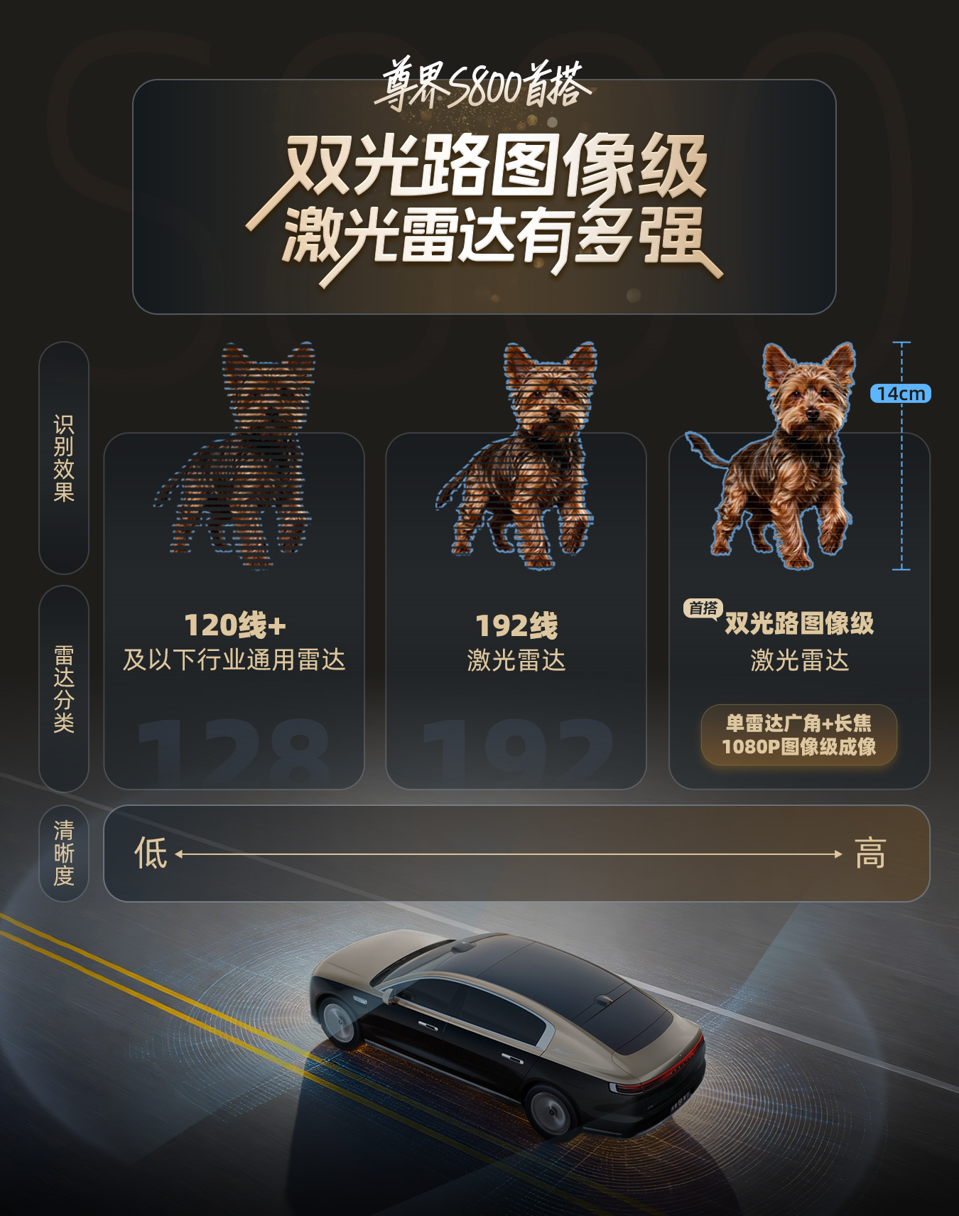 并且识别精度从之前的点阵进化到了图像。而且最小能识别到120 米外 14cm 大小的目标,这下再也不用担心马路上的小物体了,并且雨雾天和夜间这种视线不佳的场景也能稳定感知,包括激光雷达的视窗硬度提升 25%、耐久性也翻倍。