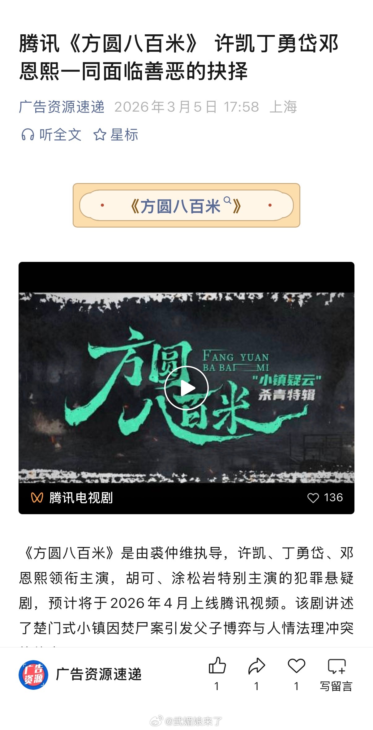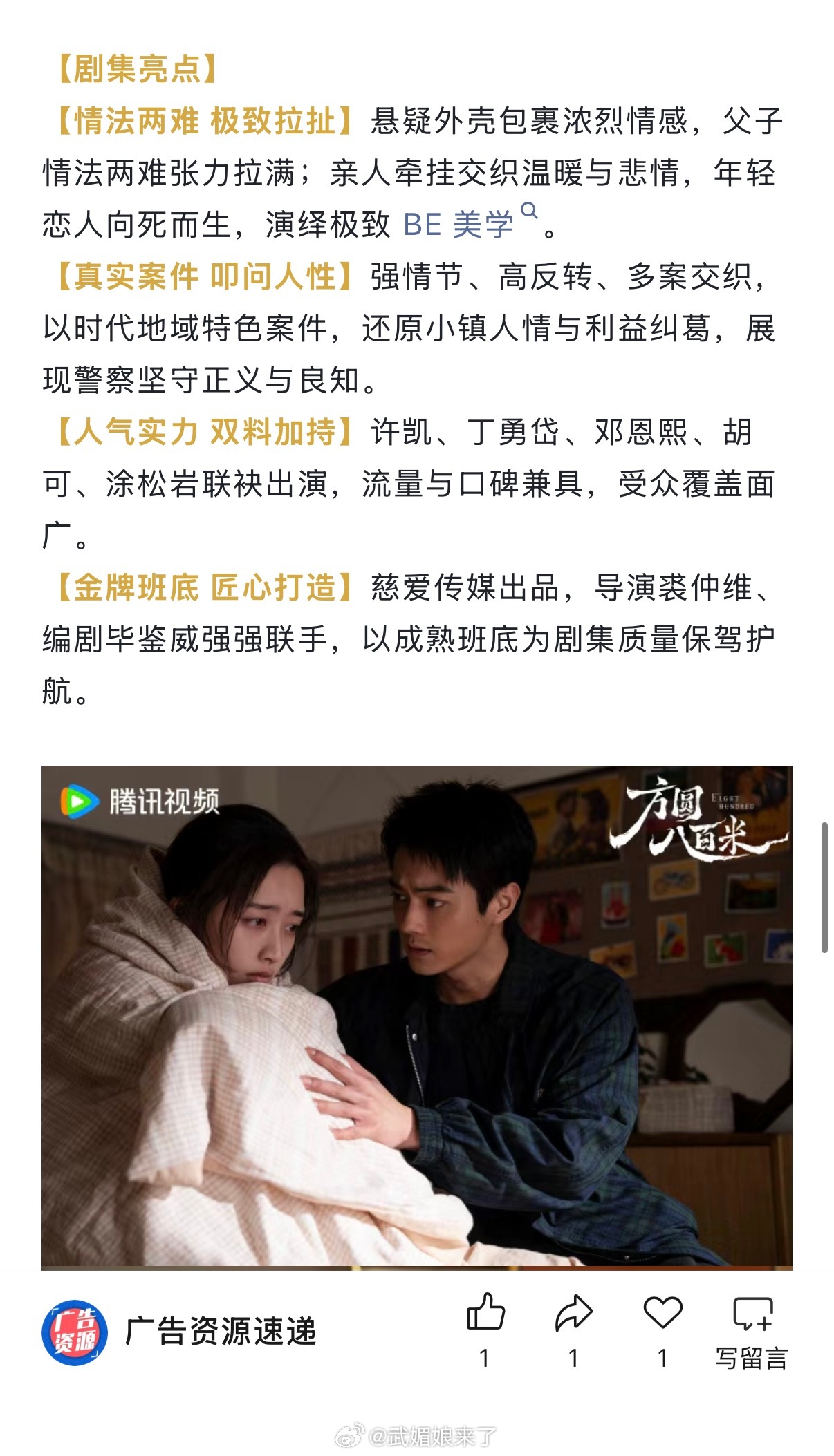 许凯、丁勇岱、邓恩熙、胡可、涂松岩等主演的犯罪悬疑剧《方圆八百米》开启播前招商!预计4月播出!期待与陈辉早日见面