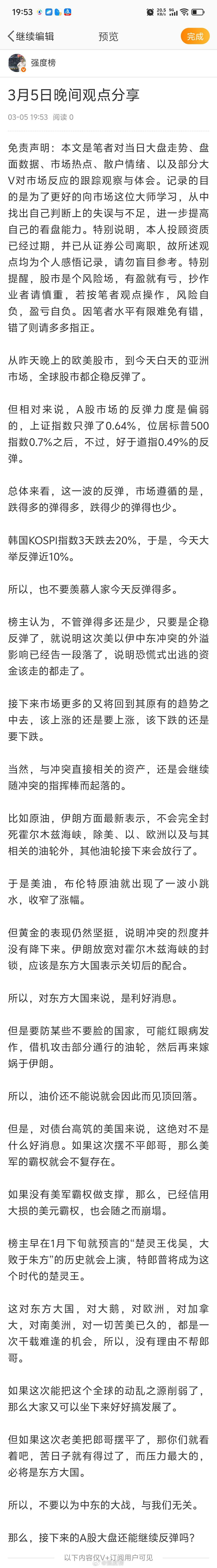 晚间分享股票A股 3月5日晚间观点分享从昨天晚上的欧美股市,到今天白天的亚洲市场,全球股市都企稳反弹了。但相对来说,A股市场的反弹力度是偏弱的,上证指数只弹了0.64%,位居标普500指数0.7%之后,不过,好于道指0.49%的反弹。总体来看,这一波的反弹,市场遵循的是,跌得多的弹得多,跌得少的弹得也少。韩国KOSPI指数3天跌去20%,于是,今天大举反弹近10%。所以,也不要羡慕人家今天反弹得多。