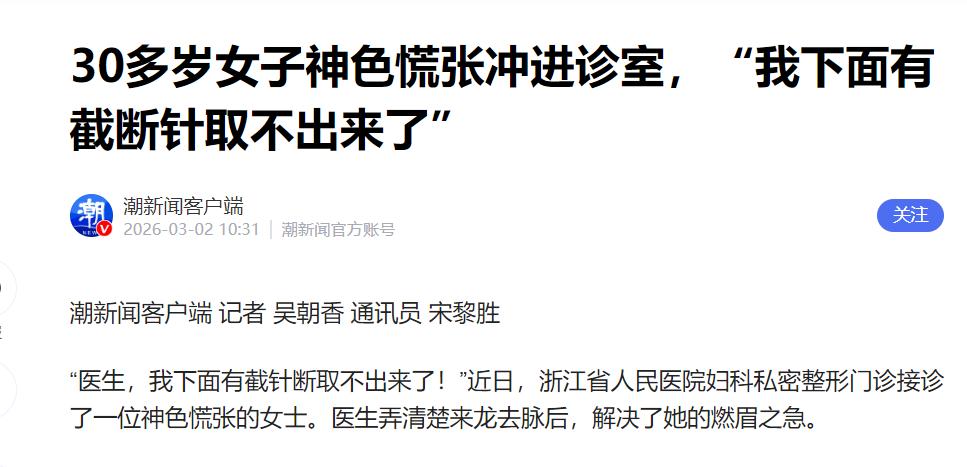 “好悬!”浙江,一女子产后,为了夫妻生活质量不受影响,去美容机构做下体紧缩术,可万万没想到,手术中,1厘米长的缝合针突然断了,然后说啥都找不到了,美容机构慌了神,让女子赶紧去医院,女子吓得不轻,撒丫子就往医院跑,结局意想不到。 这事儿要不是真实发生的,我都不敢信一根1厘米长的缝合针,就这么活生生地"消失"在了陈女士体内。而那家浙江美容院的手术室里,空气瞬间凝固成了冰。 30岁的陈女士,怎么也没想到,自己会把命差点搭在一场自以为是的"婚姻保卫战"里。顺产后留下的生理变化,在别人眼里或许是母性的勋章,可在她心里,那就是婚姻随时会裂开的缝。 她总觉得,要是自己不再像从前那样"完美",丈夫的目光迟早会移向别处。关于"后妈"和"破碎家庭"的惊恐推演,像梦魇一样缠着她,逼得她在正规医院严苛的妇检门槛前调了头,转身就钻进了那家"给钱就能做"的美容机构。 今年3月初的那个午后,她躺在手术台上,意识还清醒着,直到她捕捉到了上方操作者肉眼可见的慌乱。一句"针断里面了",像惊雷一样炸开了她自以为通往幸福的捷径。 接下来发生的事,荒诞得简直像三流恐怖片。这帮非专业的医务人员,在一个连透视设备都没有的房间里,凭着肉眼和手感一通盲目翻找。最后对着受害者摇了摇头,宣布那枚断裂的缝合针"找不到了"。 更离谱的是,由于缺乏任何医疗资质和应急预案,机构做出的决策竟然是勒令陈女士立即穿衣,自行跨城前往省级综合医院求援! 你没看错,出了这么大的医疗事故,他们不是第一时间叫救护车,不是联系专业医生,而是让受害者自己想办法! 随着麻药褪去,那根断针开始在陈女士体内展现出致命的"生命力"。它随着身体的每一次起伏、每一步行走而发生游走。那种隐隐的刺痛不仅是肉体上的,更是一场关于死亡的心理凌迟。 如果断针刺穿直肠,如果它划破尿道,如果它引发难以控制的大出血或感染,这些后果在网络搜索结果中化作一个个血淋淋的词条,几乎要把陈女士逼疯。她不敢想象,万一自己真出了事,孩子该怎么办?那个她拼命想要守护的家,会不会真的迎来一个"后妈"? 万幸的是,省医的接诊速度跑赢了死神。CT屏幕上,那个小小的、发亮的异物深深扎根在常规窥器无法触及的阴影里。专业医疗团队没有慌乱,通过定位与精准剥离,仅用20分钟,就将那根1厘米长的断针从陈女士体内彻底终结。 这枚沾血的金属片,随后被定性为"四级医疗事故"的物证。法律的账本很好计算。《民法典》1218条写得清清楚楚,美容机构的过错难辞其咎,医疗费、误工费、精神抚慰金,每一项都跑不掉,甚至还面临着行政监管的雷霆重击。 但人心里的那本账,却很难算清。陈女士为了一场自我臆想的"婚姻保卫战",把身体交给了连止损预案都没有的草台班子。她以为自己在加固家庭的堡垒,实际上却差点把命弄丢在那个简陋的手术台上。 医美与医疗之间,从来没有模糊地带,那是一条带血的红线。所谓的"给钱即办"和"绝对安全",往往只是收割焦虑的温情陷阱。 当她最后瘫坐在医院走廊,庆幸自己没有给孩子留下一个"后妈"时,真正该反思的,或许不仅仅是那根折断的针,还有那份被焦虑扭曲的、不计代价的爱美之心。 别以为这只是个例。那些打着"私密修复"旗号的黑作坊,正在全国各地疯狂收割着像陈女士这样的焦虑女性。她们不敢去正规医院,怕被问东问西,怕被家人知道,最后只能把命交给这些连医疗资质都没有的骗子。 这次是断针,下次呢?是感染?是大出血?还是再也醒不过来?