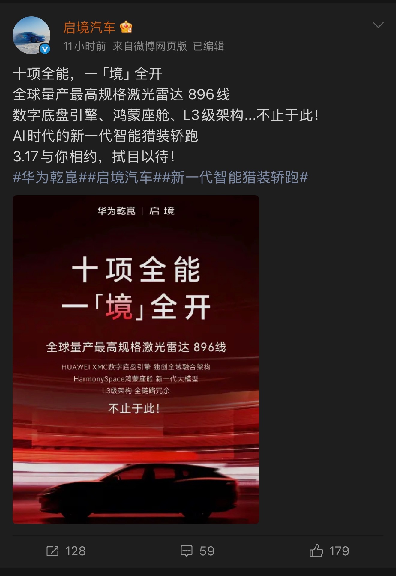 圈里都在传启境这次要出的是一款带“7”字的智能猎装轿跑,今天"一境全开"海报一出,彻底敲定技术层面上实锤了与尊界 S800技术同源,确认搭载全球量产最高规格激光雷达896线,HUAWEI XMC 乾崑数字底盘引擎,独创全域融合架构,感觉启境首款猎装轿跑自带腔调buff,再配上这套顶配科技,这个“7”字代表的七边形全能选手,绝对是今年上半年最大的黑马,值得期待!华系首款猎装轿跑启境即将亮相启境首款猎装轿跑或命名7系列