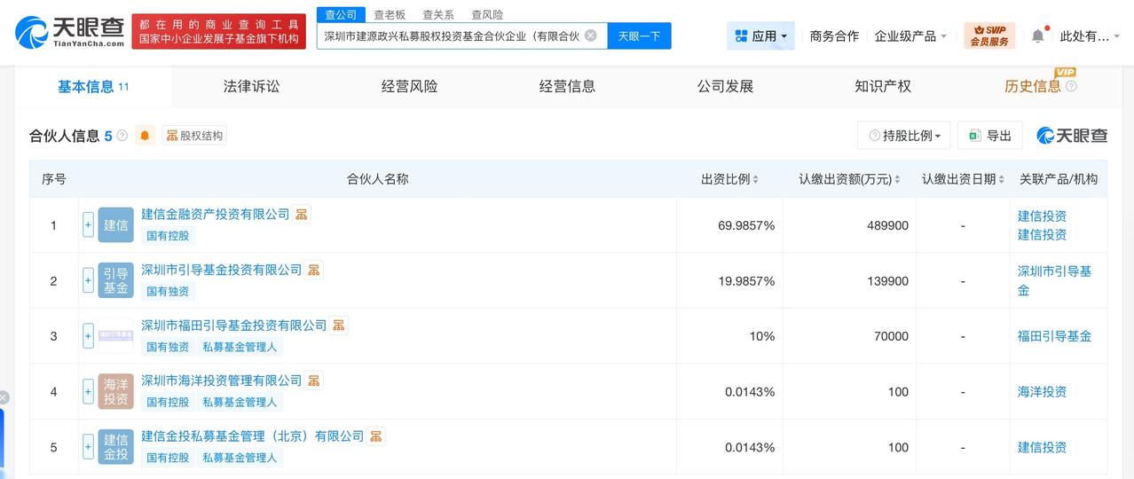 建信投资等在深圳成立私募股权基金出资额70亿 天眼查工商信息显示,近日,深圳市建源政兴私募股权投资基金合伙企业(有限合伙)成立,执行事务合伙人为深圳市海洋投资管理有限公司、建信金投私募基金管理(北京)有限公司,出资额70亿人民币,经营范围为以私募基金从事股权投资、投资管理、资产管理等活动。合伙人信息显示,该基金由建信金融资产投资有限公司、深圳市引导基金投资有限公司、深圳市福田引导基金投资有限公司等共同出资。 天眼查信息: