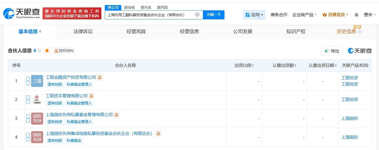 上海先导工融私募投资基金登记成立出资额70.92亿 天眼查工商信息显示,3月5日,上海先导工融私募投资基金合伙企业(有限合伙)成立,执行事务合伙人为上海国投先导私募基金管理有限公司、工银资本管理有限公司,出资额70.92亿人民币,经营范围为以私募基金从事股权投资、投资管理、资产管理等活动,由上海国投先导私募基金管理有限公司、上海国投先导集成电路私募投资基金合伙企业(有限合伙)、工银金融资产投资有限公司、工银资本管理有限公司共同出资。 天眼查信息: