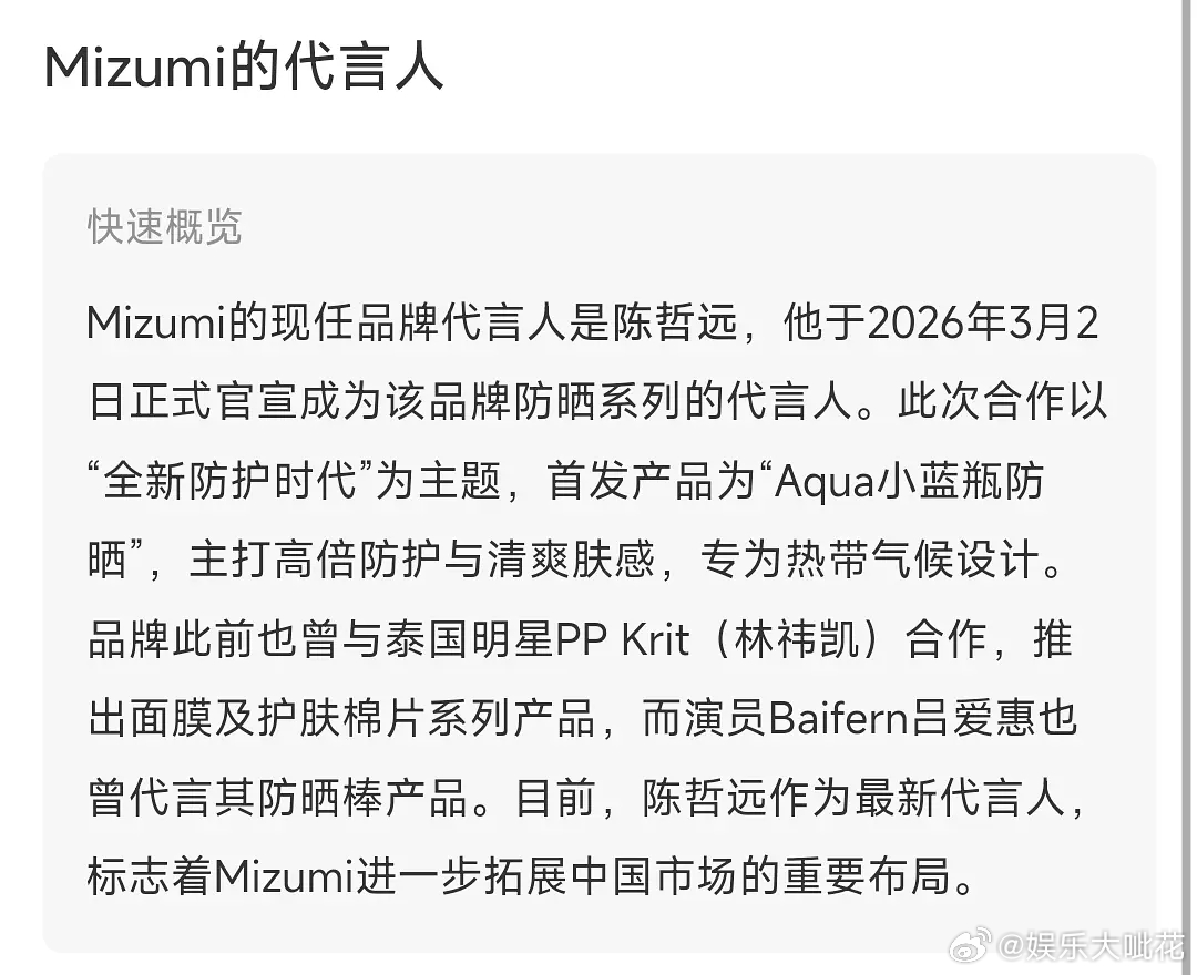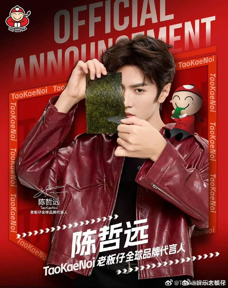 继老板仔海苔之后,陈哲远又官宣泰国国民品牌代言人了MizuMⅰ还是泰国国民品牌,过往代言人是小水和PP,海顶真的名不虚传吧