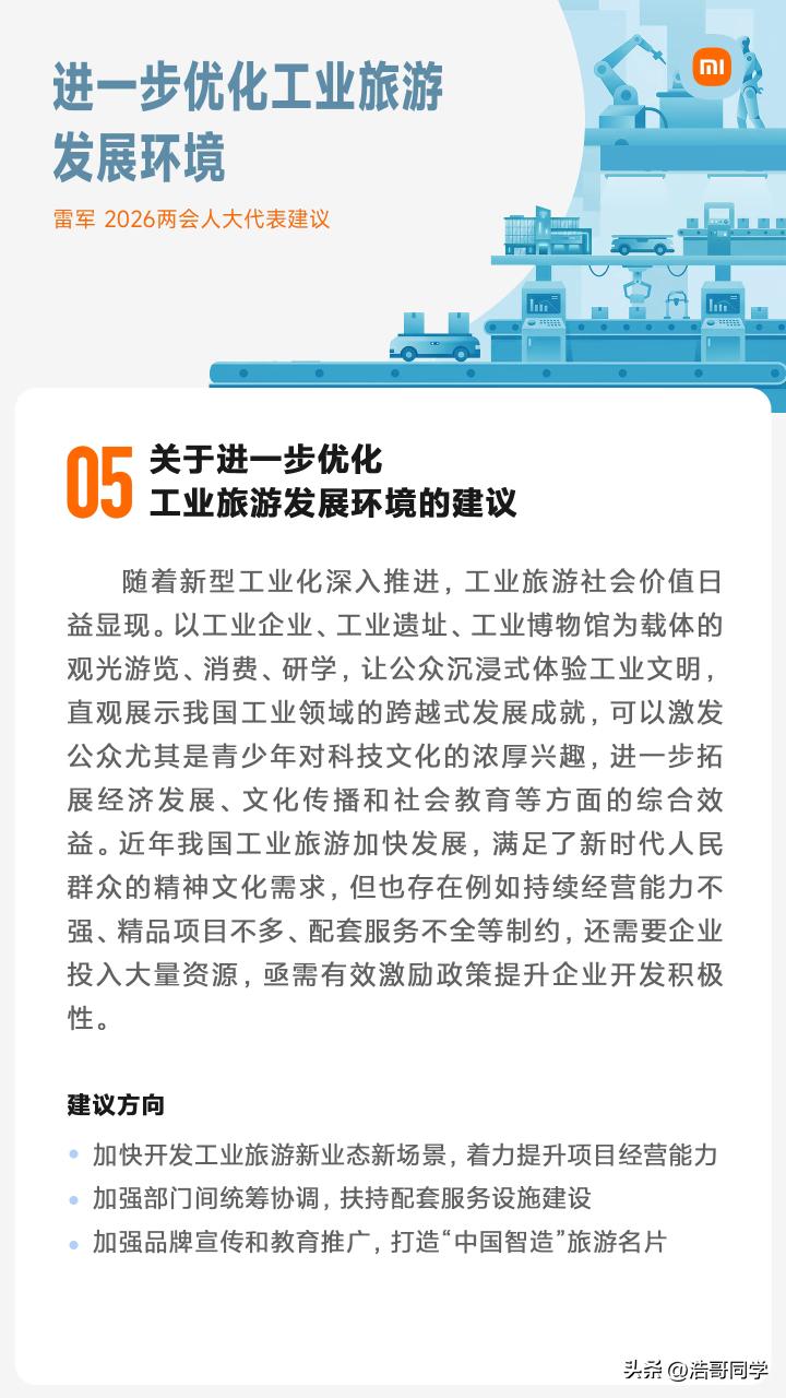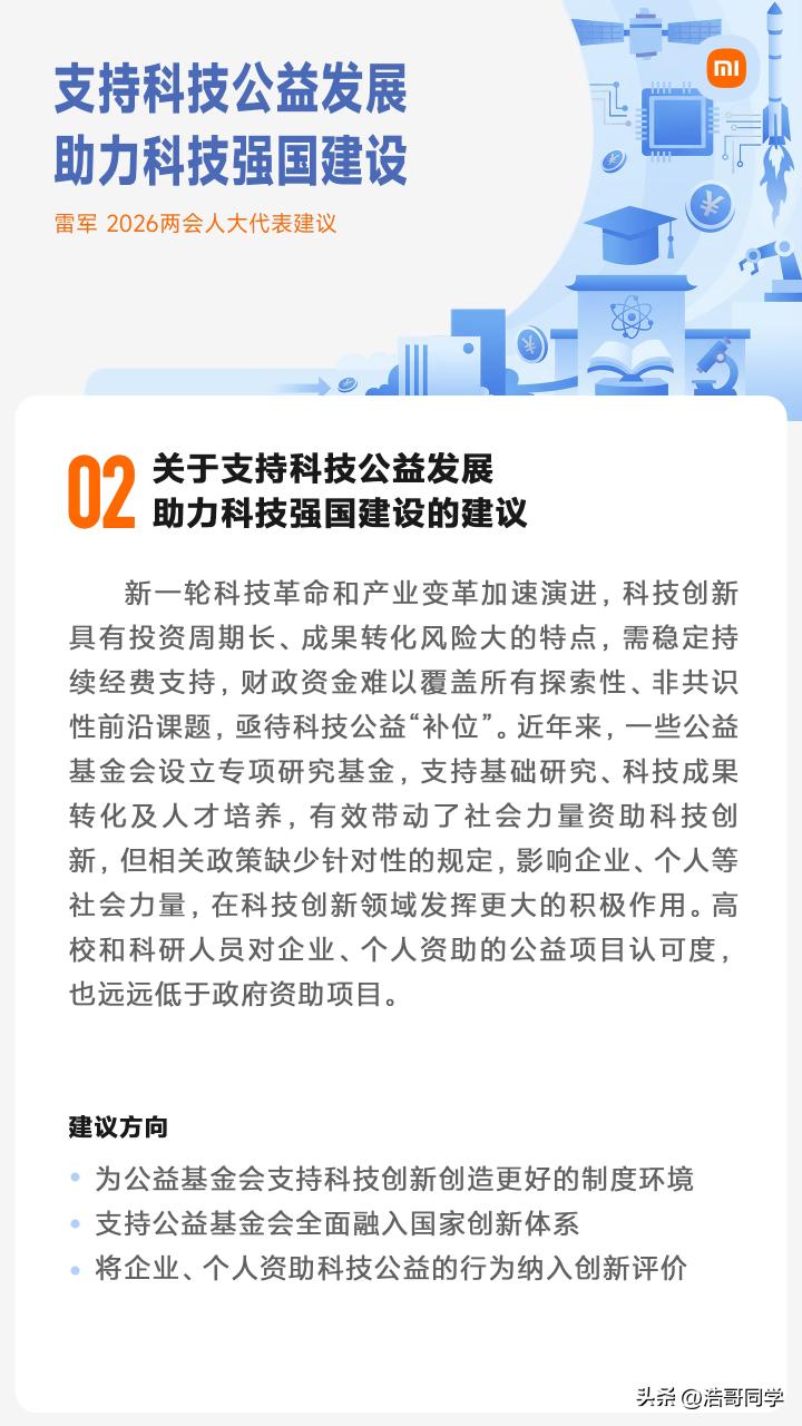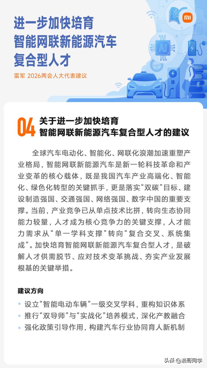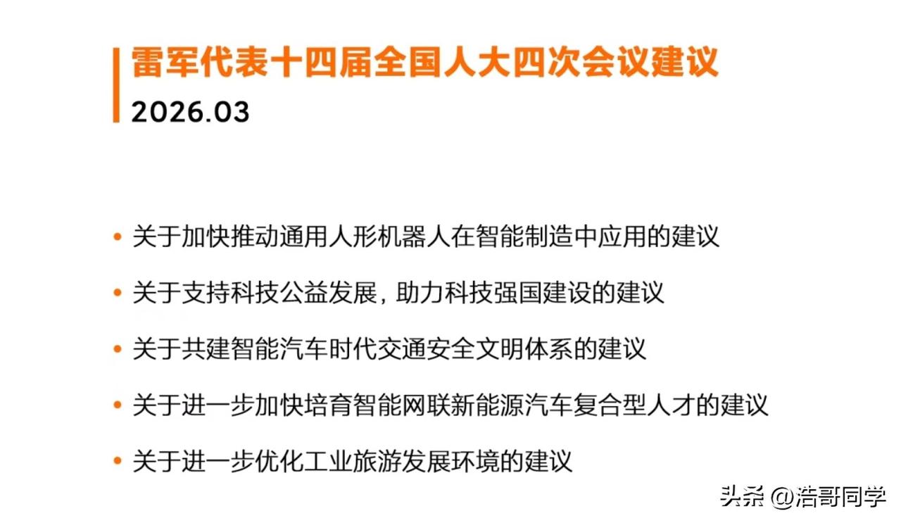 全国人大代表雷军2026年两会建议一共有5条,其中就有2条是关于智能新能源汽车的建议。 一般看雷总的建议就可以推测出小米集团未来的发展方向,人形机器人是继计算机、智能手机、智能新能源汽车后的颠覆产品,当科技发展到一定的程度,人形机器人必将是科技企业的主流产品。春晚中宇树机器人爆火全球,去年的机器人只能扭秧歌,今年的春晚就可以翻跟头了……可以说我国人形机器人的发展是迅速的。期待小米的人形机器人越来越强大!雷军小米车 小米有前途 雷军创业金句 雷军爆火发言 小米雷语 雷军 雷军小米市值 雷军两会拍照 雷军普通话