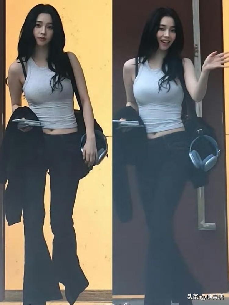刘亦菲这条裤子挺养生,毕竟降温了肚脐眼必须护住啊