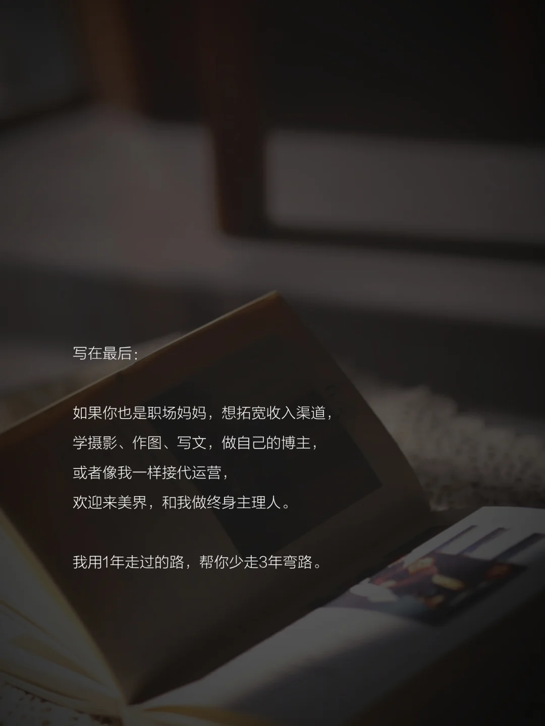 如果你也是职场妈妈,想拓宽收入渠道,学摄影、作图、写文,做自己的博主,或者像我一样接代运营,欢迎来链·接,和我做自己的终身主理人。