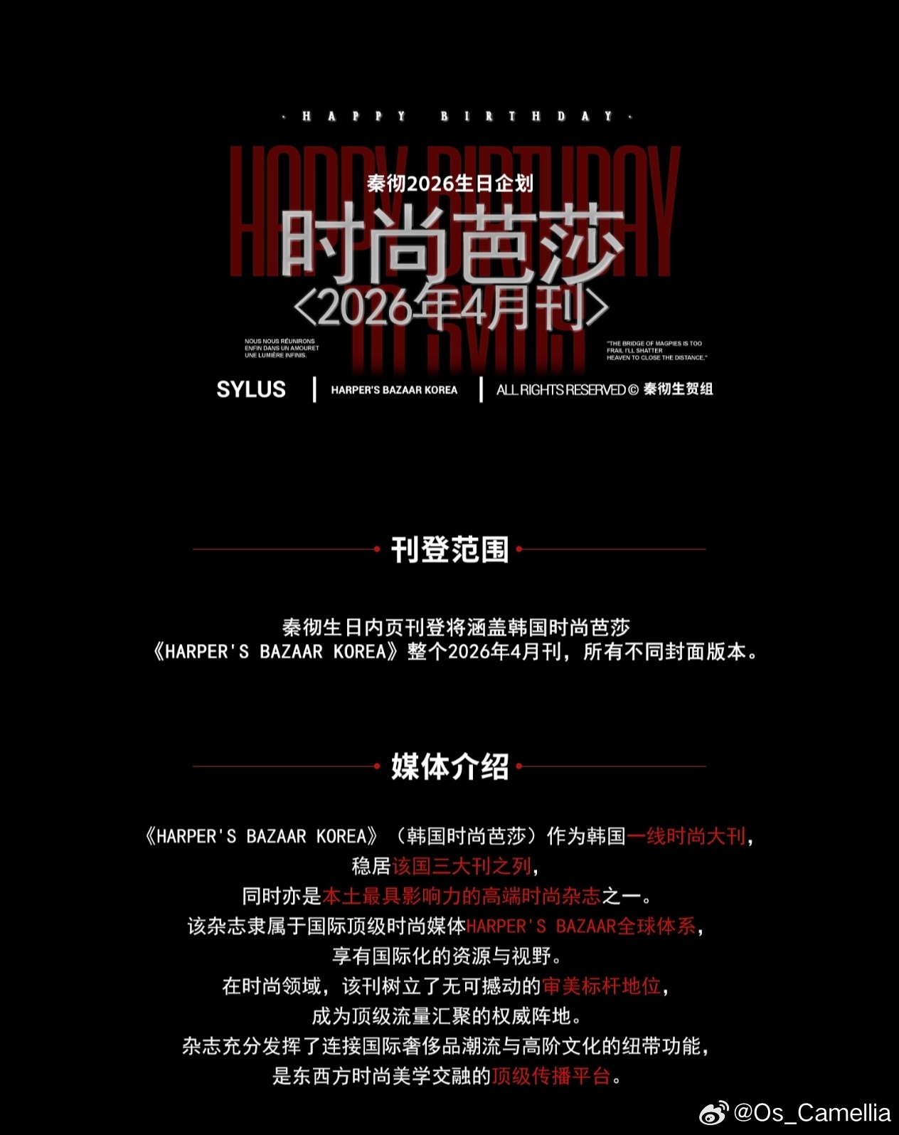 秦彻生日内页刊登将涵盖韩国时尚芭莎《Harper's Bazaar Korea》整个2026年4月刊,所有不同封面版本。