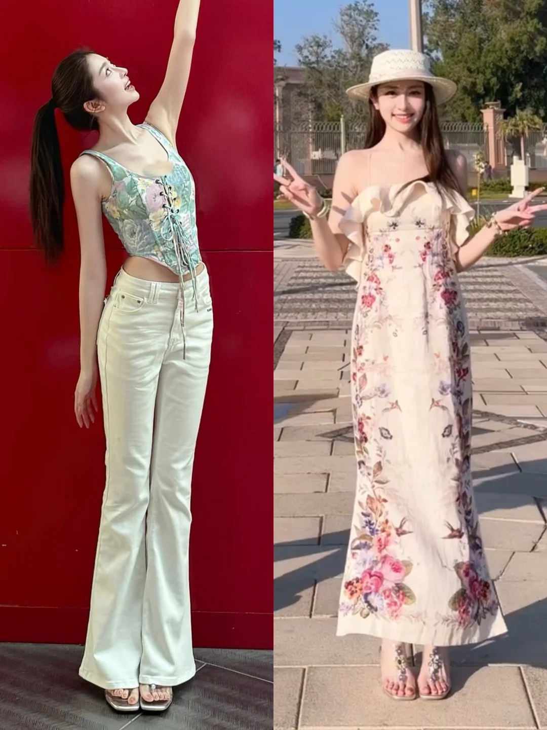👗LOOK 1|印花长裙+千百度编织拖鞋