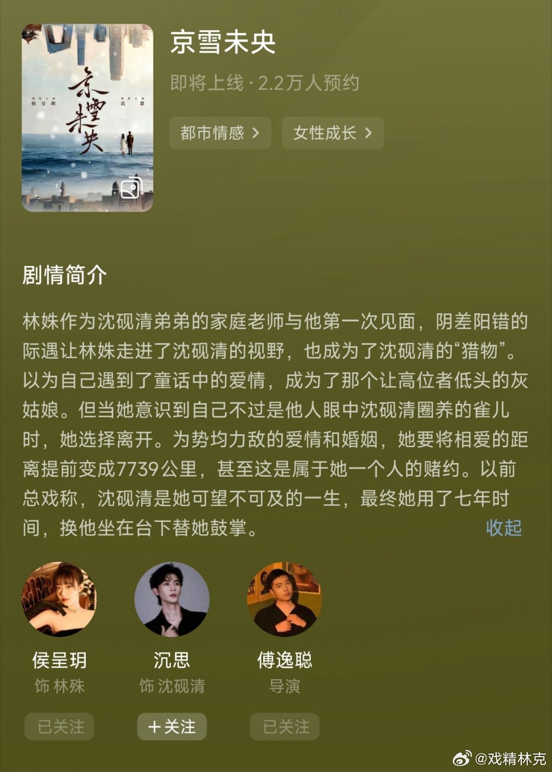 京雪未央:侯呈玥+沉思,今天开机。傅逸聪之前直播说很喜欢这个剧本,觉得是自己拍短剧以来遇到的最好的一个本子了,觉得这个ip题材可能不是大众市场的本子,但是是他超爱的本子,因为这个本比较难拍,对男女主演技要求高,所以目前没有人拍。希望他不是瞎吹的