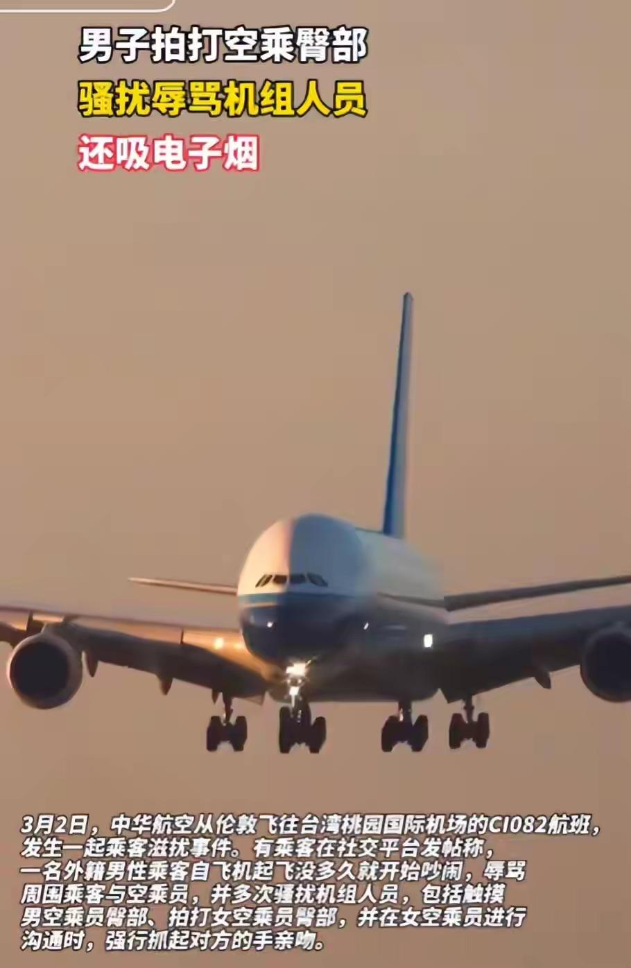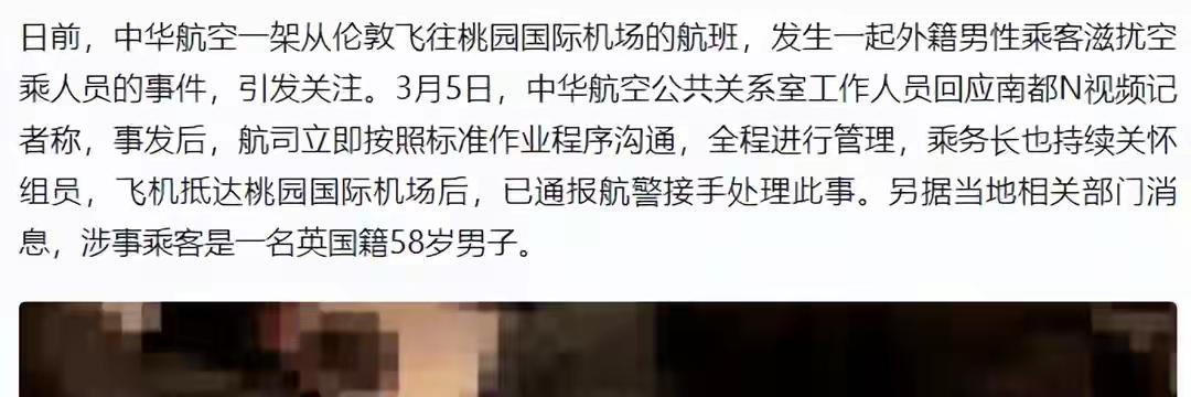 英国男子大闹中国航班!多次摸空姐屁股,还抽烟骂乘客,警方介入 这个应该男子可真是嚣张! 3月5日,南方都市报发布了一篇文章,里面的内容看的让人火冒三丈,有一趟从伦敦飞中国的航班,却被一个58岁的英国男子闹成了“空地狱”。 不仅在机舱里面大闹,还多次拍空姐屁股、强行抓手亲吻、抽电子烟、骂乘客、踹椅背,-样没落下。 更离谱的是,这个应该男子的妻子全程就在旁边,不仅不拦着,还在狡辩男子只是爱跟大家开玩笑。 十三小时的航班,从伦敦到台北,本该是一场安静的空中旅程。可这位穿着曼联外套的英国男子,硬是把机舱变成了他撒野的私人酒吧。飞机刚起飞没多久,他就开始了自己的“表演”。 辱骂乘客、踹前排椅背、在座位上手舞足蹈,整个后舱的旅客都被他折腾得神经紧绷。有人实在忍不住回头看了他一眼,换来的是一串更难听的脏话。这哪里是坐飞机,分明是花钱买罪受。 更让人愤怒的是他对空乘人员动手动脚。一名女空乘在过道里经过,他抬手就是一巴掌拍在人家臀部上。那清脆的响声,让周围的乘客都愣住了。女空乘当场脸就白了,提出抗议,换来的却是他更加不堪入耳的辱骂。 没过多久,他又盯上另一位女空乘。人家来跟他沟通,想让他安静一点,他倒好,一把抓住人家的手腕,拉到嘴边就亲了一口。这哪是开玩笑,这是赤裸裸的猥亵。空姐强忍着泪水,还要继续维持职业微笑,心里得多委屈。 旁边有人实在看不下去,掏出手机拍下了这一幕。画面里,这个醉醺醺的男人被机场警察架着往外走,嘴里还在嘟嘟囔囔:“我道歉,对不起,我摸了你的屁股,真他妈的。” 听听这话,这叫道歉?这分明是挑衅。 最让人无语的是他那位坐在旁边的妻子。从头到尾,她就跟个没事人一样,看着自己男人撒泼打滚,一句劝阻的话都没有。等别的乘客忍不住说她两句,她居然轻飘飘来了一句:他只是喜欢开玩笑。周围人当场就炸了:这好笑吗?你这是帮凶。 飞机上明文规定禁止吸烟,他不管,掏出电子烟就吞云吐雾。机组人员闻到烟味过来询问,他还装无辜,说不是自己。可等人家一走,他又拿出来抽。这种人,眼里根本没有规矩两个字。 这趟航班是中华航空从伦敦飞台北的CI082航班。三月二日起飞,三月三号落地。飞机刚一停稳,等在廊桥口的警察就直接上来把人带走了。那一刻,整个机舱的乘客都想鼓掌。 消息传回国内,网友们炸了锅。有人说这老小子是喝多了,有人说是借酒装疯。不管是真醉还是假醉,摸人家空姐屁股的时候,他可清醒得很。五十八岁的人了,这点分寸都没有,几十年白活了。 他妻子那句“只是开玩笑”,听着更让人来气。自己男人骚扰别人,她不拦着,反而帮着狡辩,这是什么三观。这种人,就该让他尝尝咱们中国法律的厉害。 中华航空的回应很干脆:零容忍。飞机一落地就报警,全程配合调查,这种态度值得点赞。机组人员在万米高空面对这种人,既要保证航班正常运行,又要维护自身尊严,太难了。 当地警方把人带回去之后,不光要查他抽烟的事,还要看他那些骚扰行为够不够得上刑事犯罪。电子烟被扣了,人也被带走了,这老小子这下清醒了吧。 有人说他是英国人,在英国可能没人管他。但这是在中国人的航班上,在中国人的地盘上,就得守中国人的规矩。摸一把屁股就想走?没那么便宜的事。 这些年,飞机上闹事的外国人不止这一个。有人撒泼,有人打骂,最后都是怎么处理的?该拘留拘留,该罚款罚款。法律面前,不分国籍,只看行为。 这事也给所有人提了个醒,出门在外,别把自己太当回事。飞机是公共空间,不是你家的客厅。你喝多了撒酒疯,影响的是一飞机的人。人家空乘是来服务的,不是来受气的。 更可恨的是他妻子的那句“开玩笑”。摸人家屁股叫开玩笑?那让你老公也摸摸你试试。这种人,就是欠收拾。 现在好了,警察介入,证据确凿,视频也有,人证也有,看他还能往哪儿跑。接下来就等着看,台湾地区那边会怎么处理他。这种人,就该让他长长记性,别以为出了英国还能无法无天。 麻烦看官老爷们右上角点击一下“关注”,既方便您进行讨论和分享,又能给您带来不一样的参与感,感谢您的支持! 各位读者你们怎么看?欢迎在评论区讨论。
