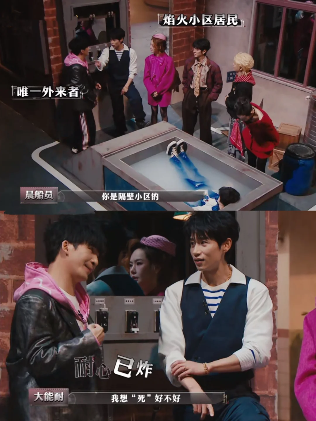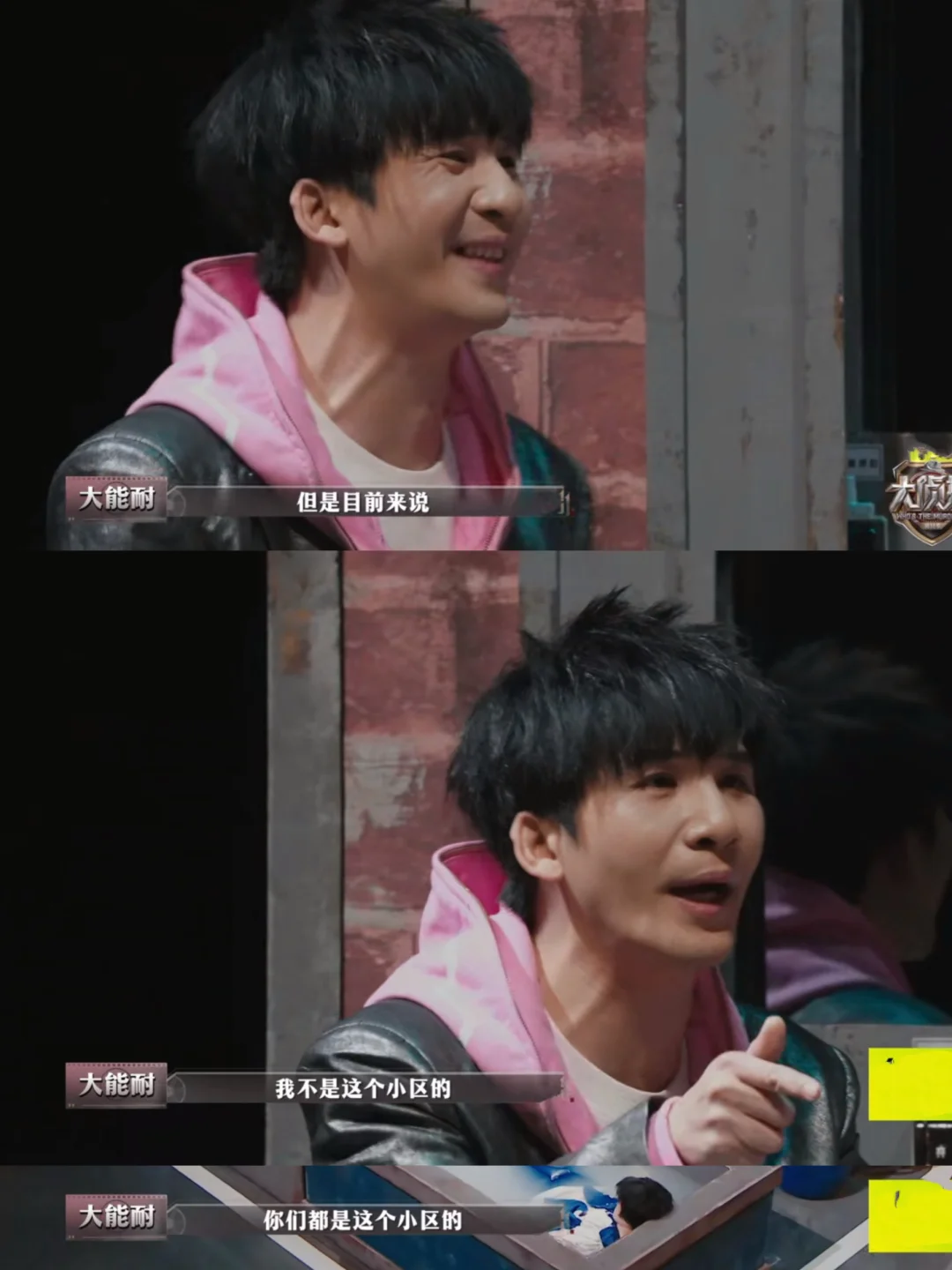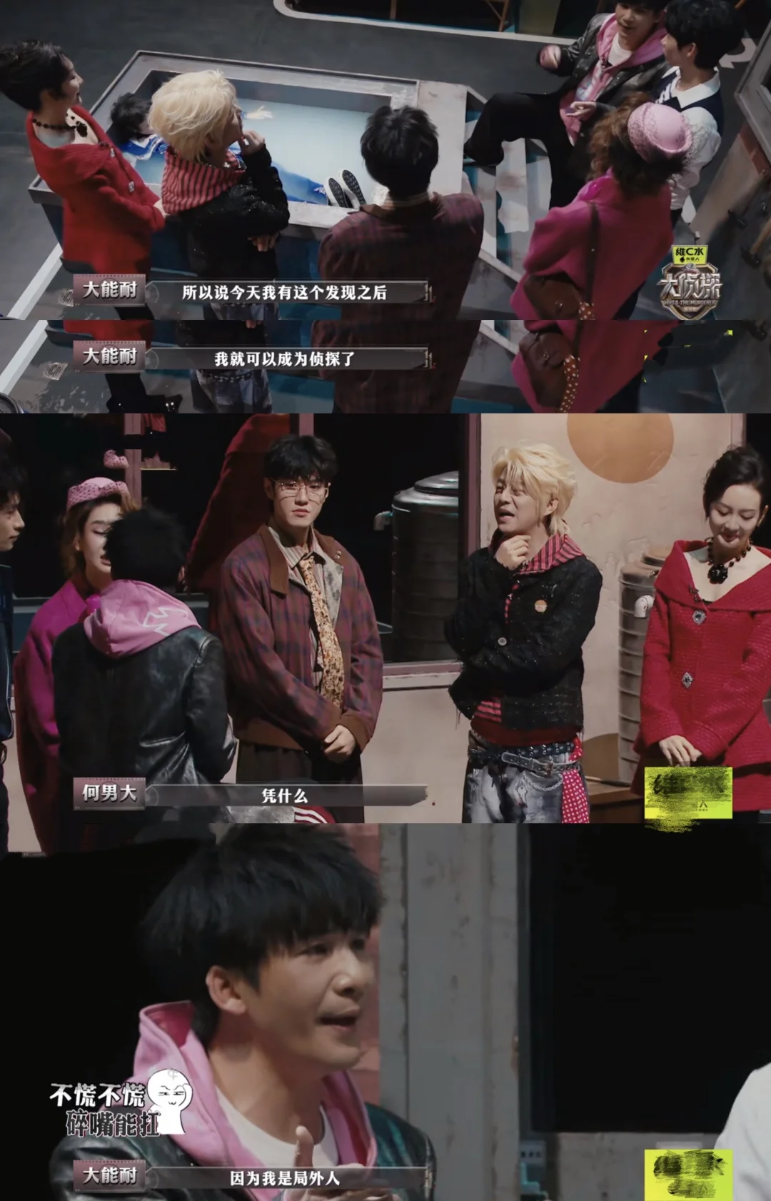 大:我砸锅卖铁,什么都能干 哲:收破烂的吧 大:我看到“真象”浮出水面,所以我是侦探 何:凭什么 大:因为我不是这个小区的,你们都是这个小区的 晨:你是隔壁小区的? 大:[抓狂R]我想“死”好不好,让我去“死” [大笑R]