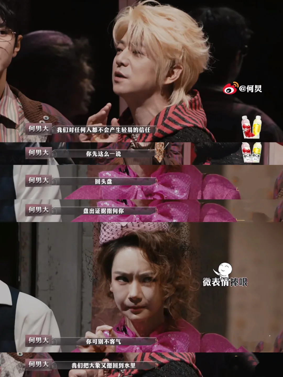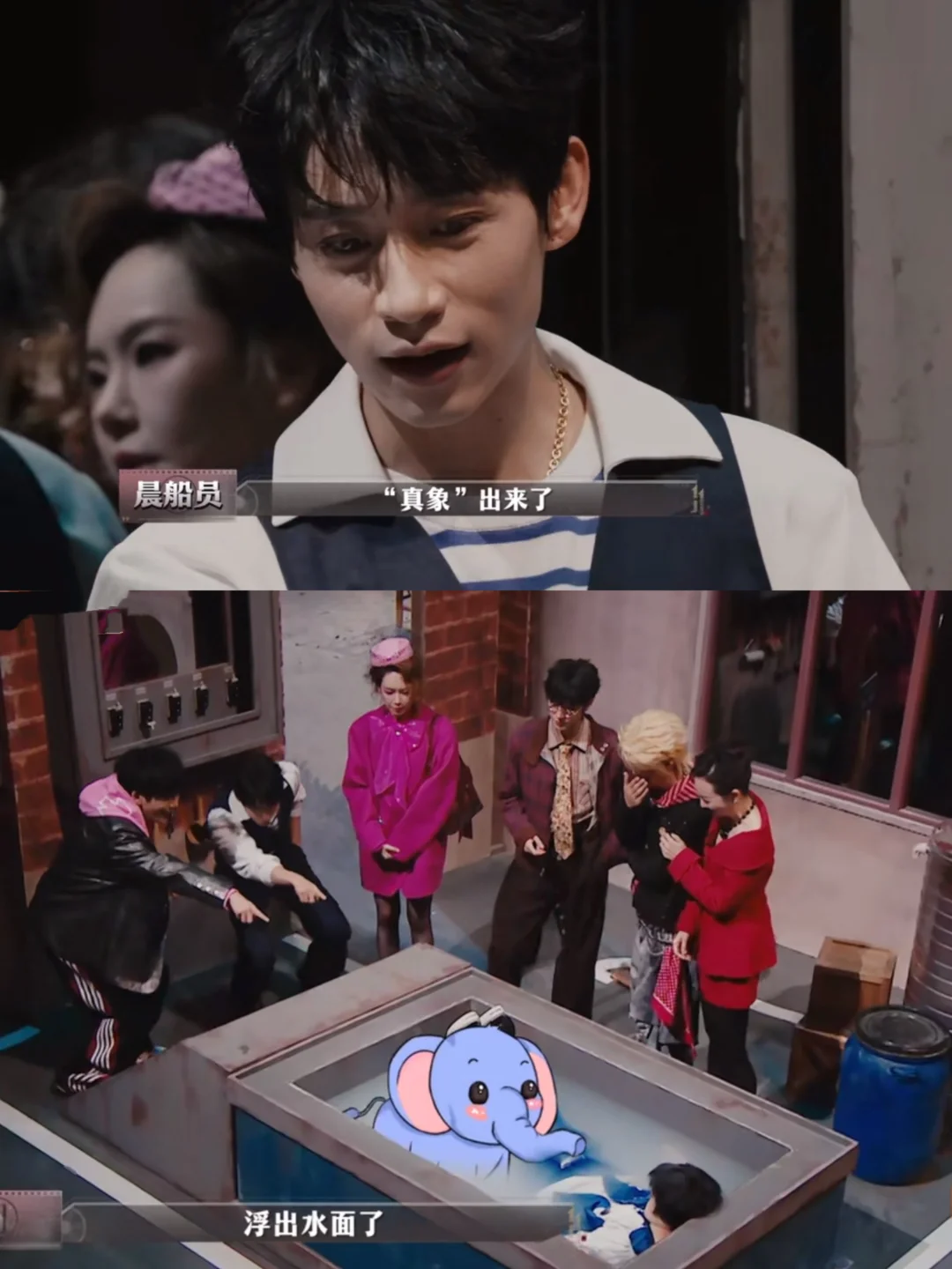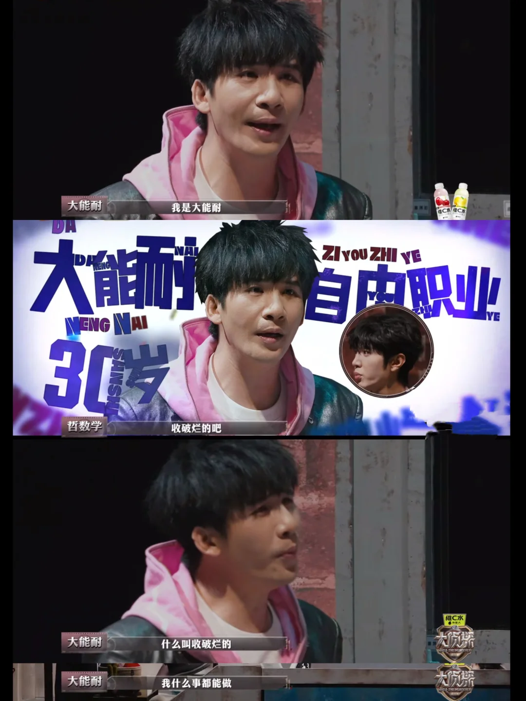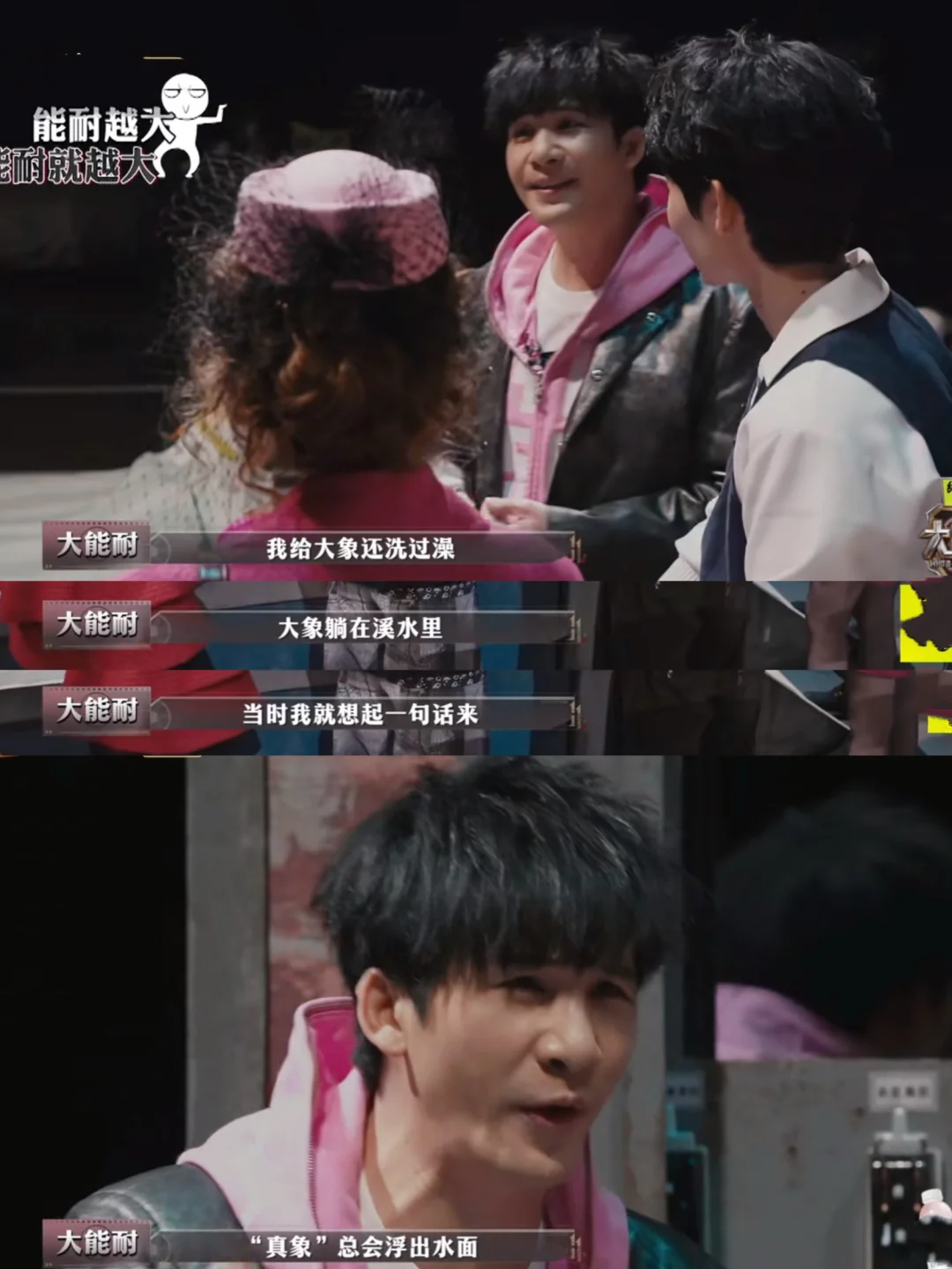大:我砸锅卖铁,什么都能干 哲:收破烂的吧 大:我看到“真象”浮出水面,所以我是侦探 何:凭什么 大:因为我不是这个小区的,你们都是这个小区的 晨:你是隔壁小区的? 大:[抓狂R]我想“死”好不好,让我去“死” [大笑R]