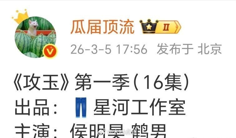 攻玉主演 侯明昊鹤男 吃到侯明昊新剧的🍉啦《攻玉》第一季,支持古风小生无缝进组~搭档鹤男,奶新人没完了 攻玉一开始说影视化就在接触侯明昊了 ,终于把侯明昊磨下来了吗?侯明昊确实挺适合蔺承佑的,鹤男是👖系艺人给个女主也正常,反正这戏应该是侯明昊单人过会,定男选女 《攻玉》这个阵容看起来还挺合适的,开始定影视化的时候主演就在传侯明昊,一直没变过。侯明昊在裤的成绩也很好,95生里面唯一一个三部一番全破万的,经常单人过会了,这次应该也是定男选女