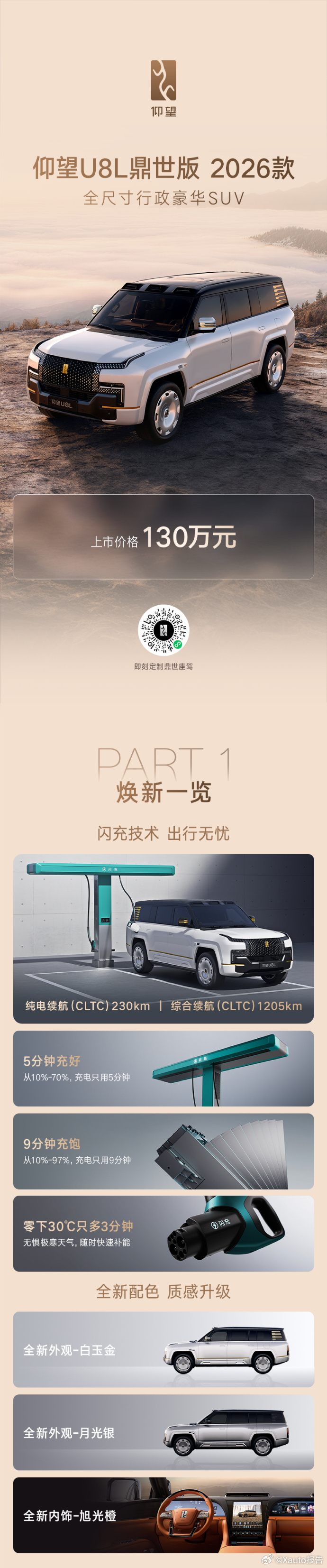 一图读懂仰望u8l2026款现已正式上市,售价130万元!仰望汽车26款闪充焕新升级比亚迪闪充充饱只用9分钟比亚迪闪充零下30度12分钟充饱比亚迪全球首创闪充桩来了比亚迪宣布建设2万座闪充站