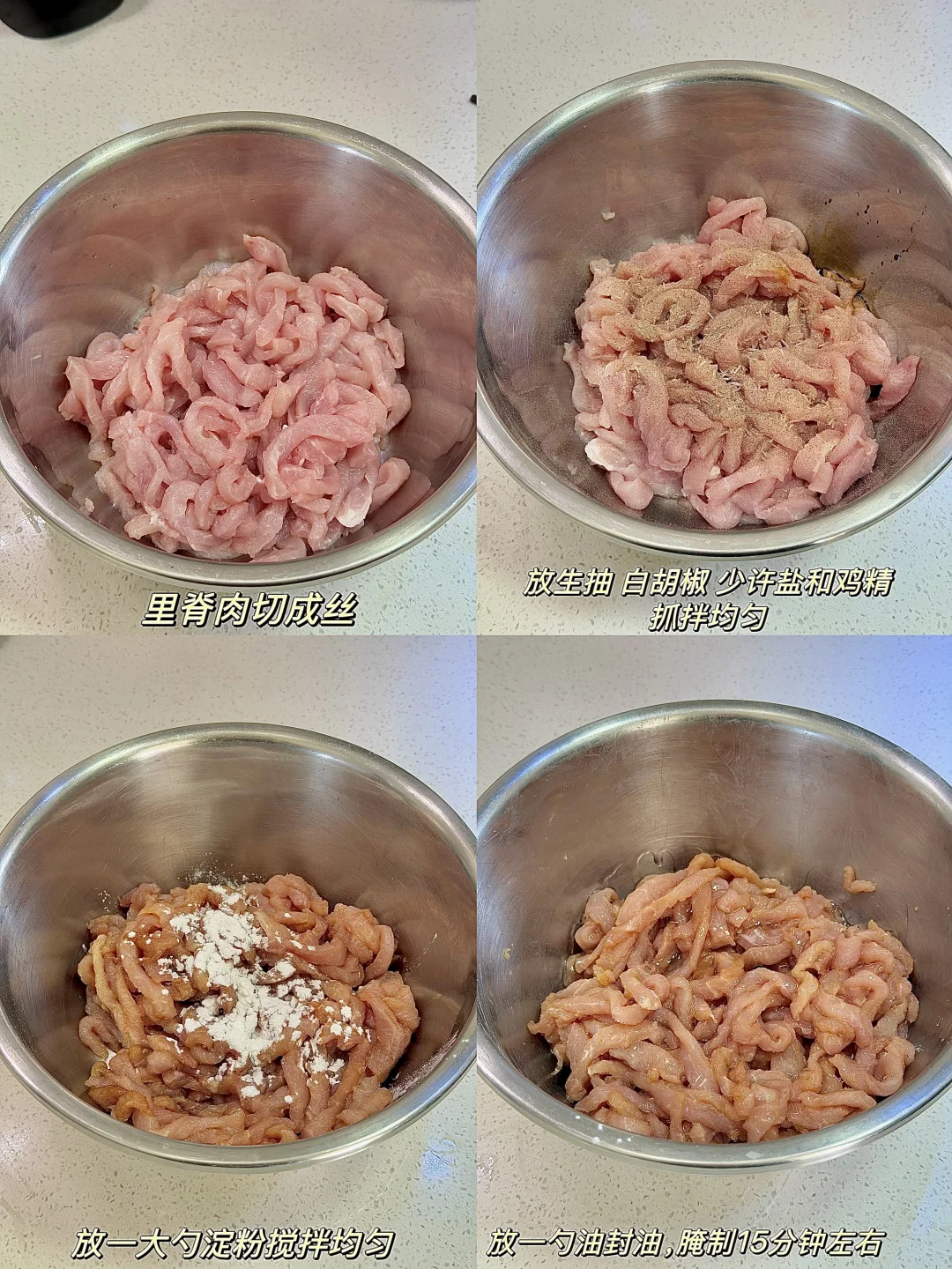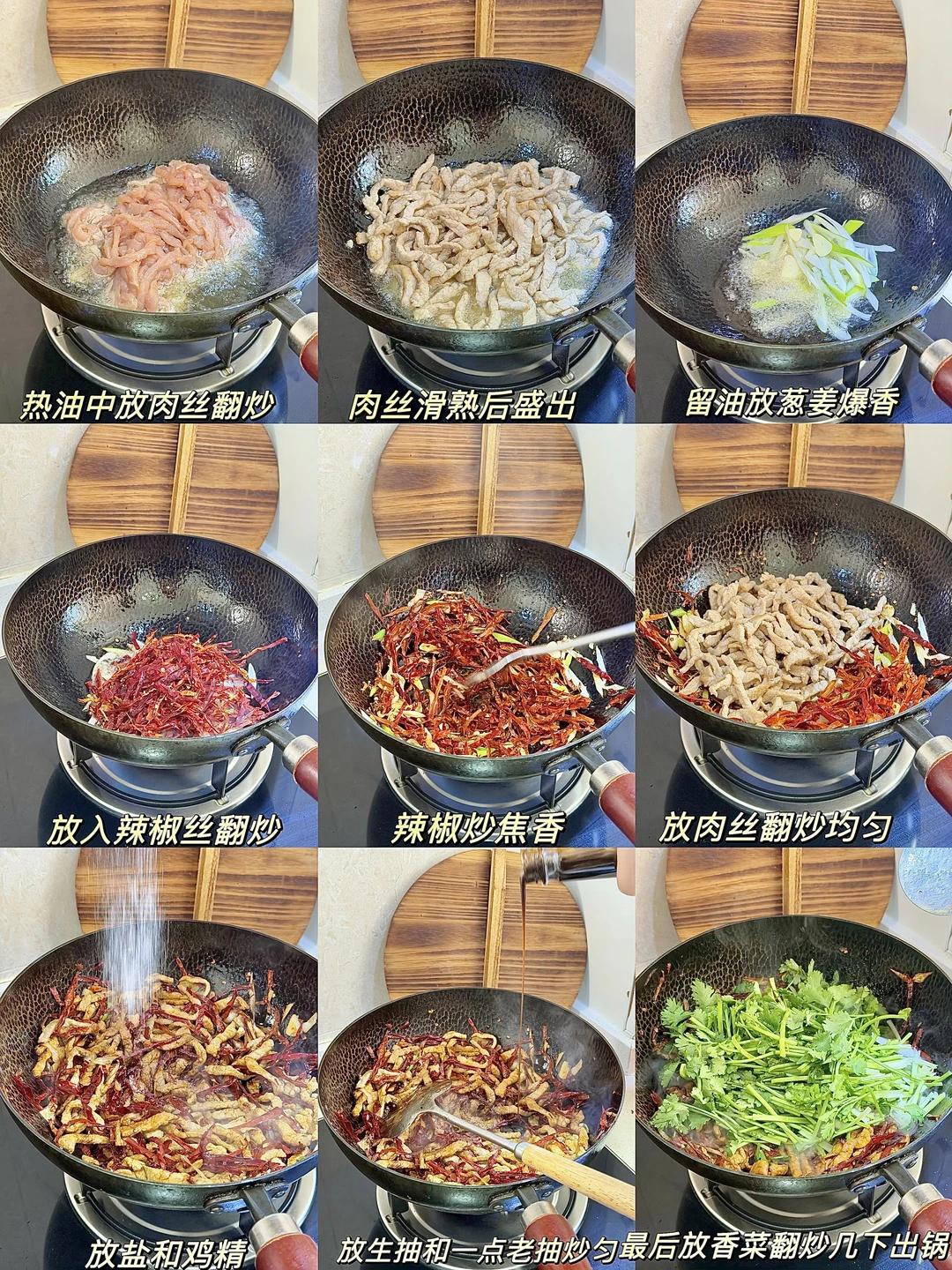 今日份美食分享: 香辣肉丝 . 食材:里脊肉 红辣椒丝 香菜 做法如图上⬆️ . 上次做的春饼的香辣肉丝大家都要教程 今天就来了哦 真的真的巨好吃😋