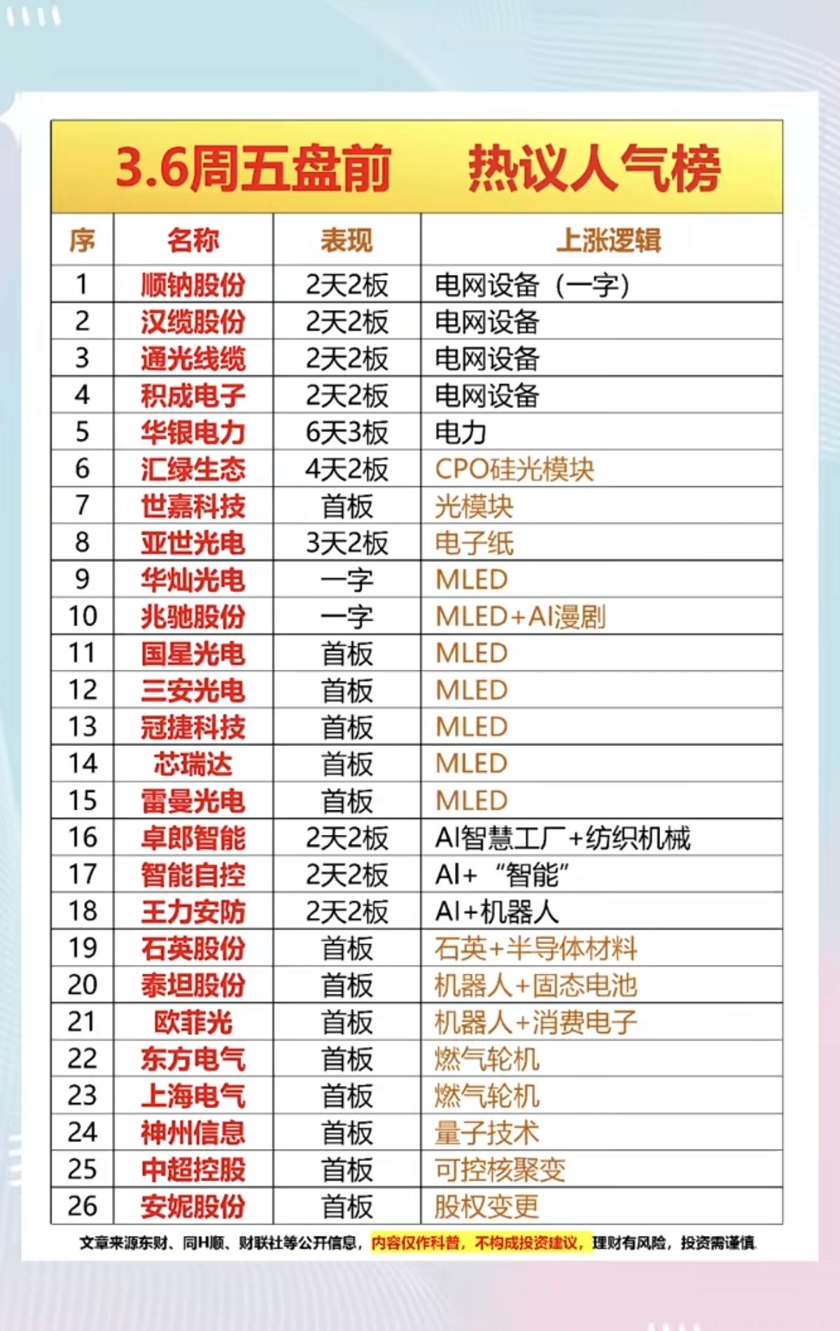 3.6周五 成交活跃个股+人气热搜榜! 1.电网设备 2.CPO光模块 3.MLED 4.机器人 5.燃气轮机