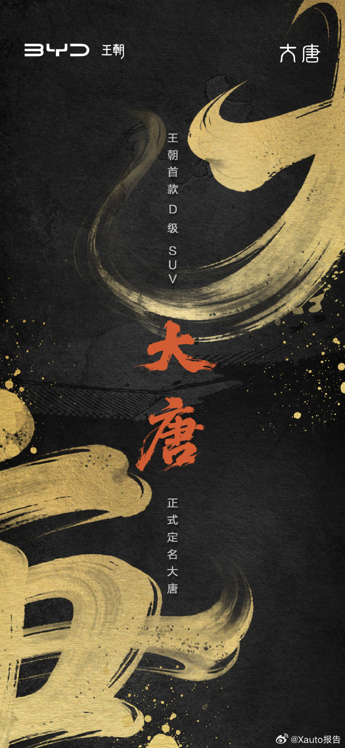 比亚迪王朝首款D级SUV定名大唐比亚迪王朝首款D级旗舰SUV正式定名“大唐”,以“大”显格局,以“唐”承华夏文脉。新车代表技术与体验全面跃升,定位东方高端旗舰,已全球首发亮相。D级SUV大唐全球首发亮相王朝首款D级SUV比亚迪全球首创闪充桩来了比亚迪闪充充饱只用9分钟