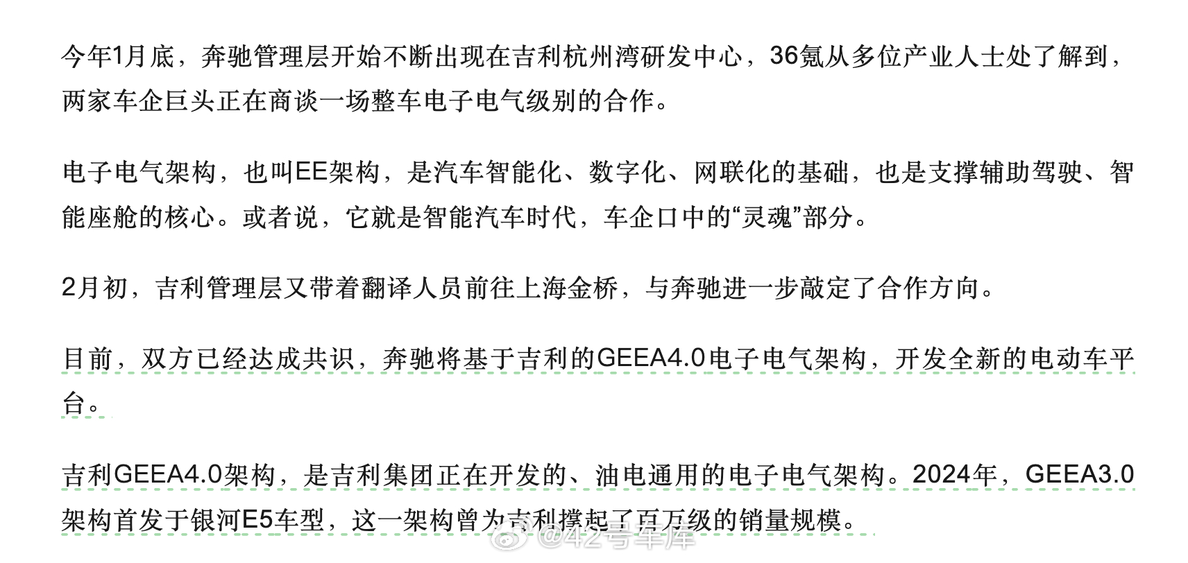 36氪汽车报道,奔驰新车平台将采用吉利架构:奔驰将基于吉利的 GEEA4.0 电子电气架构,开发全新的电动车平台。