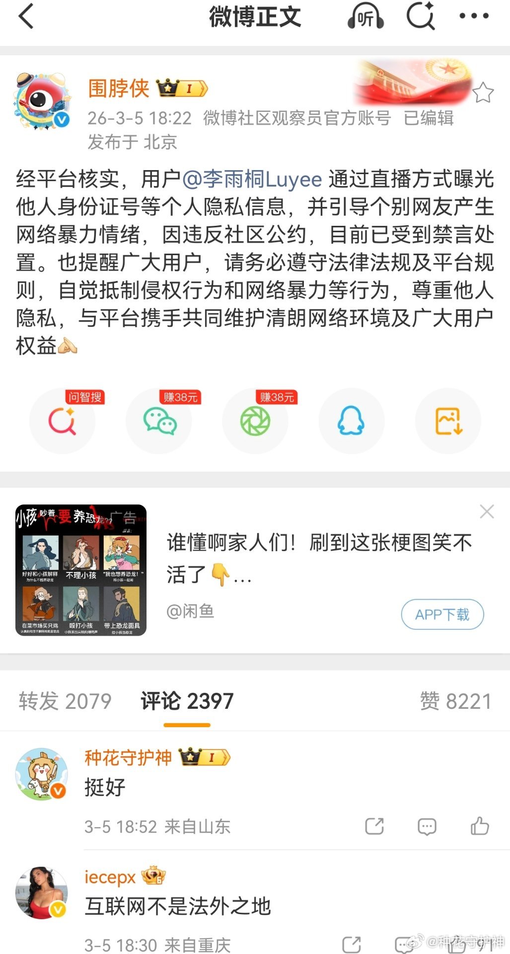 答:经平台核实,用户通过直播方式曝光他人身份证号等个人隐私信息,并引导个别网友产生网络暴力情绪,因违反社区公约,目前已受到禁言处置。也提醒广大用户,请务必遵守法律法规及平台规则,自觉抵制侵权行为和网络暴力等行为,尊重他人隐私,与平台携手共同维护清朗网络环境及广大用户权益