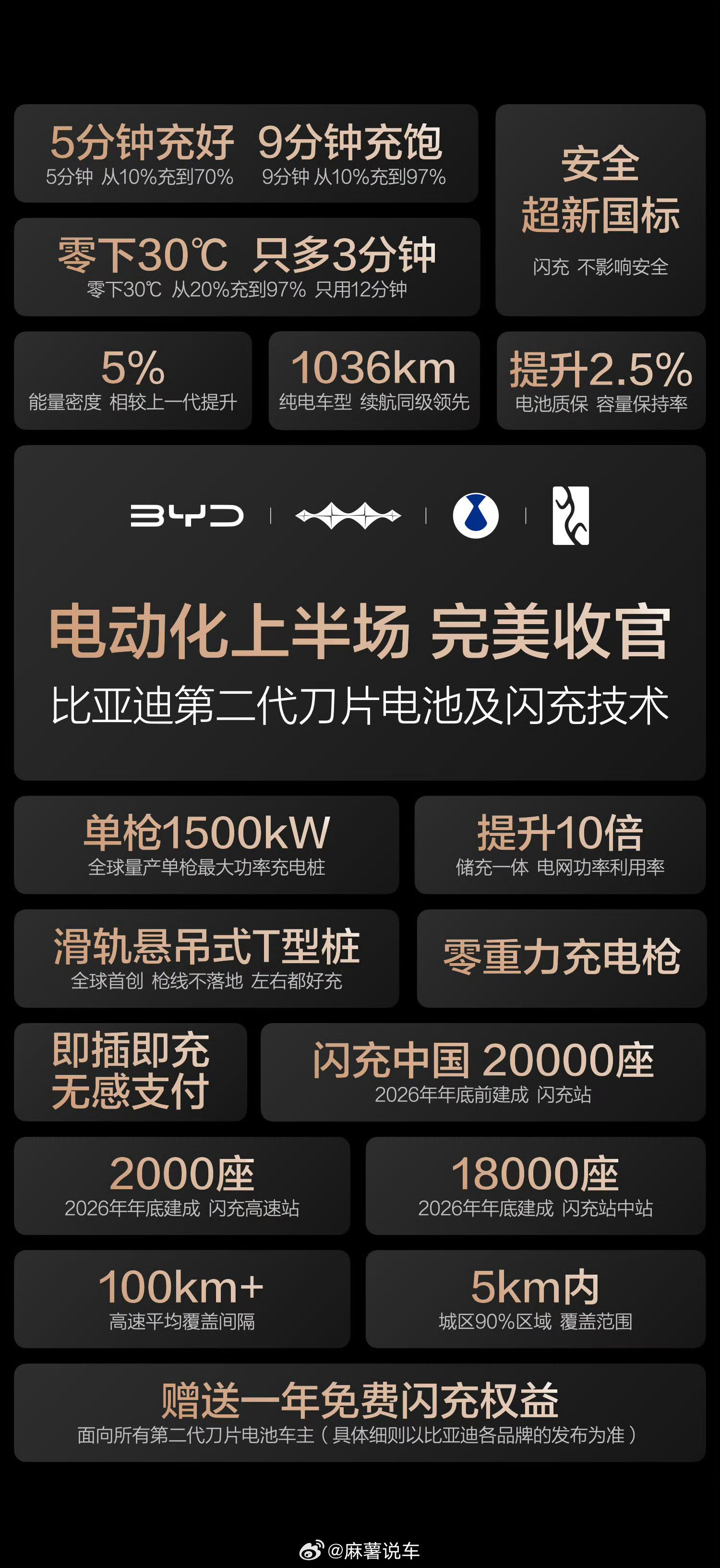 比亚迪第二代刀片电池现在选电动车,安全永远是第一位。比亚迪第二代刀片电池这次的测试数据真的很有说服力,边闪充边针刺都能做到不起火不冒烟,就算完成500次闪充循环,相当于日常行驶30万公里之后,再进行同样测试,表现依然非常稳定。底部抗撞击测试更是达到10倍新国标强度,安全性拉满。在保证极致安全的同时,它还支持超快闪充速度,续航也能突破1000公里,再加上更长的使用寿命和更全面的质保政策,综合表现非常突出。所有测试标准都远高于行业要求,用真实数据体现技术实力。有这样的电池作为保障,日常用车和长途出行都更安心,也让大家对新能源汽车的安全和实用性更有信心。比亚迪闪充充饱只用9分钟比亚迪宣布建设2万座闪充站