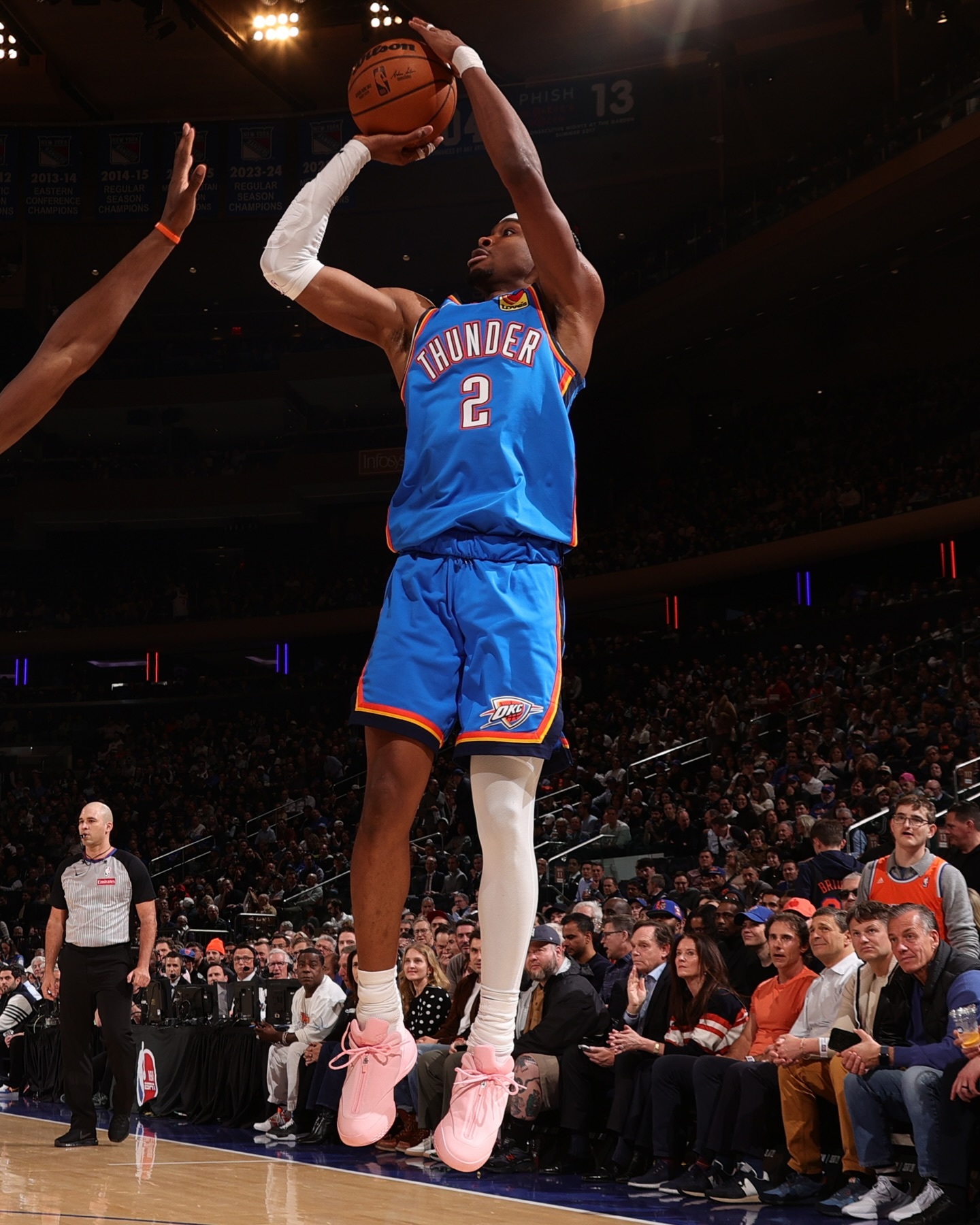SGA今日上脚Converse SHAI 001 “Pink”。他在本场比赛中砍下26分,连续124场得分20+,将个人连续得分20+的场次进一步扩大至124场,继续坐稳NBA历史第二的纪录(距离张伯伦的126场仅差2场)。