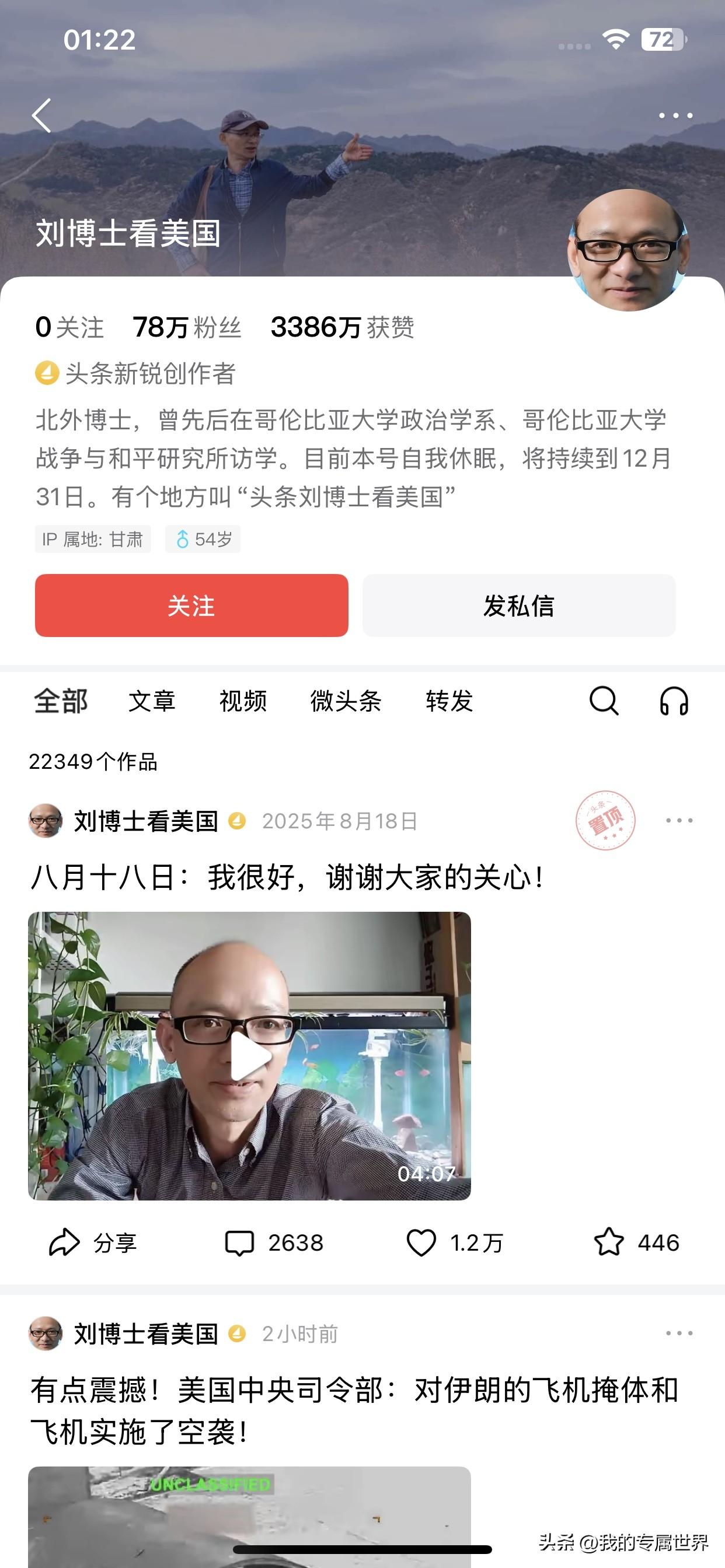 这个刘博士就是典型的美粉,之前俄乌战争,他伪装成是乌克兰的和平主义支持者,即使怀疑他,毕竟当时俄罗斯先侵略了乌克兰,有帮乌粉帮他说话,现在美国伊朗交火,他开始明着支持美国以色列,刻意夸大伊朗损失惨重,美国不用多久就能拿下伊朗,他是美粉已经毋庸置疑,和魔戒里面的咕噜很像,从他的眼神里就能看出这个人很阴和狡猾的面目特征,。
