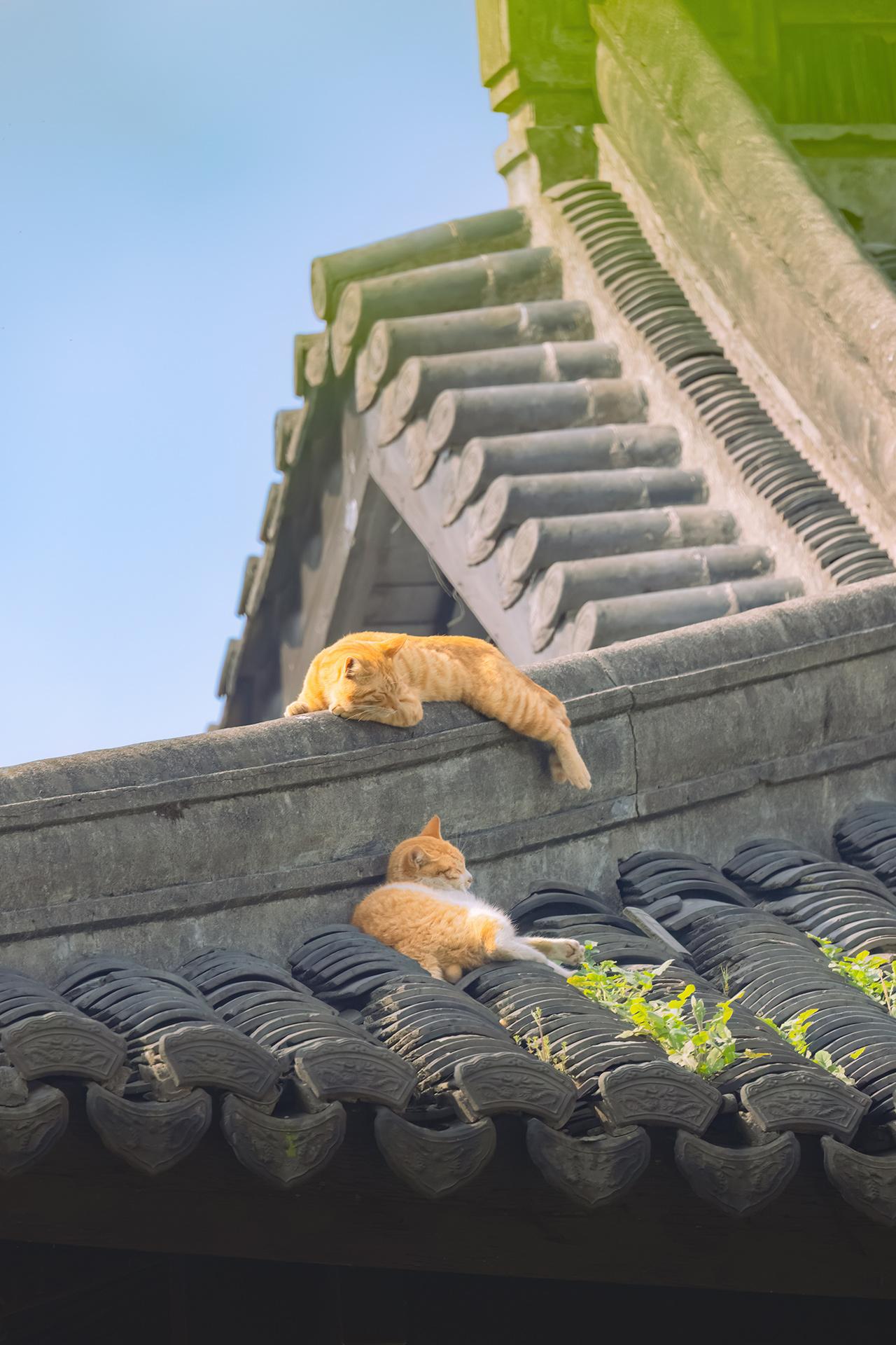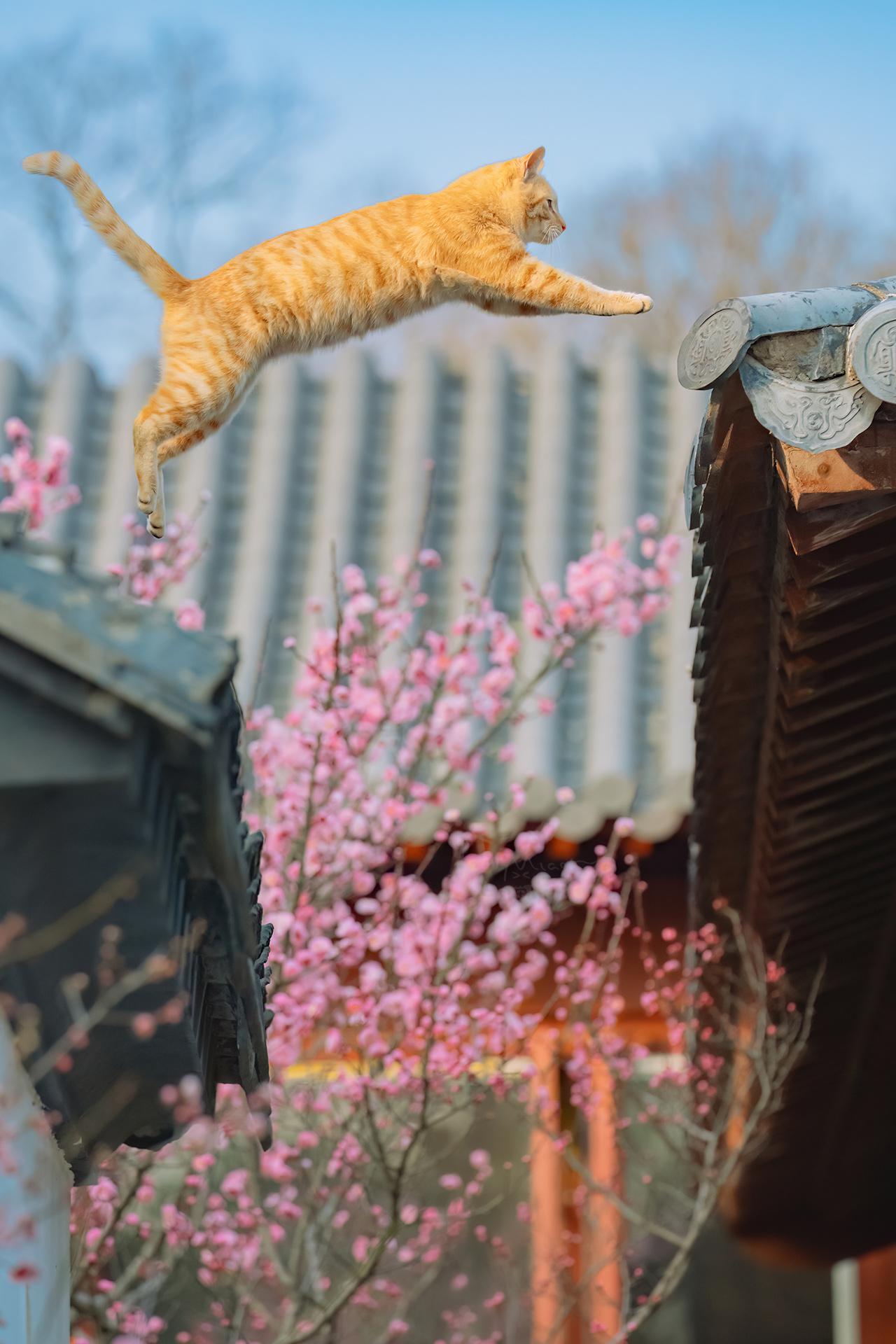 江南老街上,拍到了双猫飞跃。同一位置,同一只大橘,一月的时候拍到过单猫...