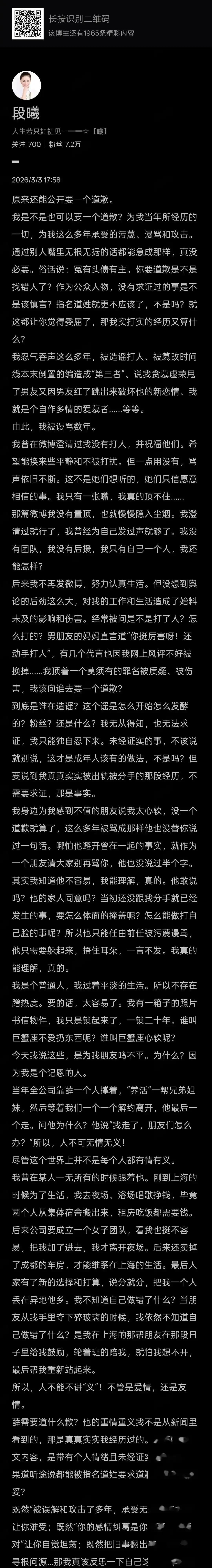 最近,娱乐圈炸出一条大瓜:18年前谢娜被“扇耳光”的旧闻被前女友段曦揭开,真相竟是子虚乌有。段曦发长信控诉,张杰昔日感情纠葛被曝光,引发热议。 这不是简单翻旧账,而是利益算盘。谢娜和张杰18年沉默,换来深情人设加持,避开“出轨”风险。段曦当年陪张杰打拼,却被塑造成“疯婆子”,承受网络暴力。 娱乐圈类似事件屡见不鲜,据权威数据,负面传闻可致明星形象受损20%以上。真相被掩盖18年,凸显舆论操控的残酷。归根结底,个人利益往往压倒公道,弱者自救虽晚,但至少戳破了那层遮羞布。