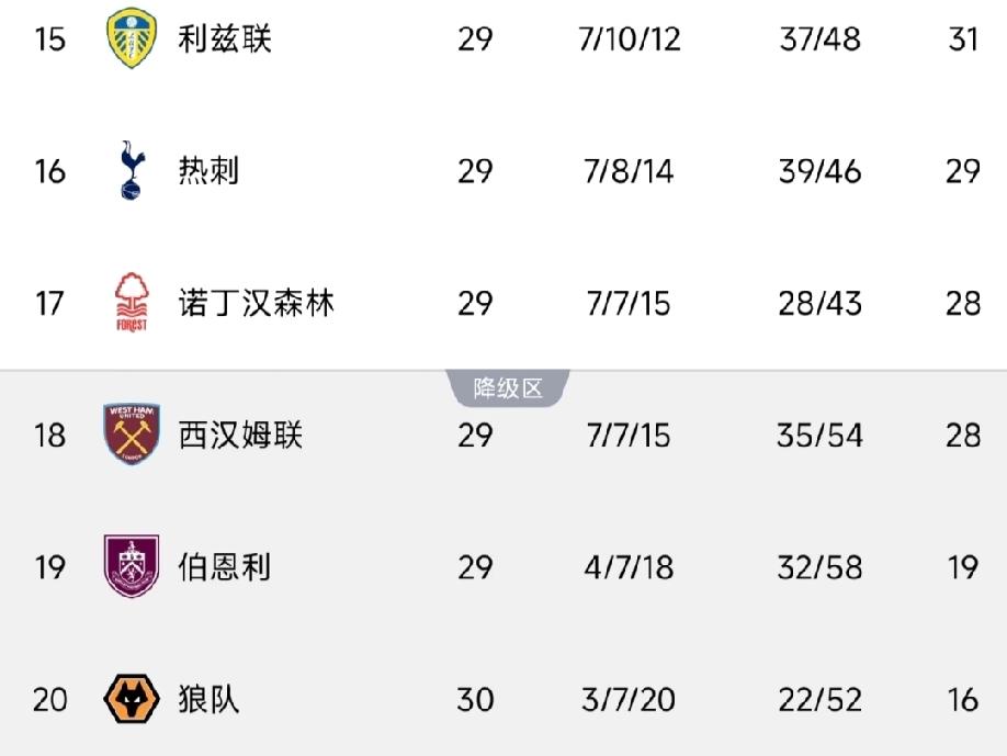 英超的保级和争冠、争欧冠席位大戏一样的精彩!谁能想到,去年还在跟big6争夺欧冠席位的诺丁汉森林和热刺队本赛季到现在还深陷降级区泥沼不能自拔! 目前,排名最后两位的伯恩利和狼队差不多已经铁定降级了,最后一个名额将会在西汉姆联、森林、热刺以及利兹联这几队中产生,估计不到最后一轮是很难见分晓的! 大家觉得谁会是那最后一个倒霉蛋?