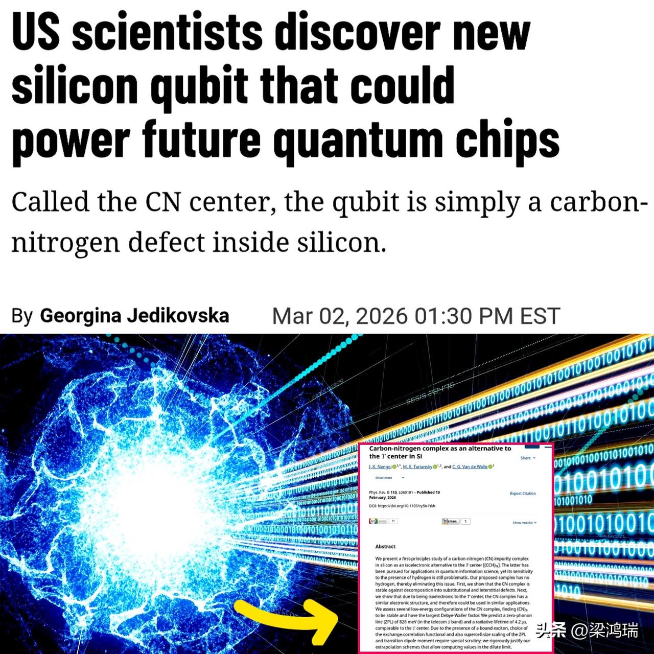 美国科学家(主要来自加州大学圣塔芭芭拉分校,UC Santa Barbara)于 2026年3月初 发现了一种名为 CN中心 (CN center) 的新型硅基量子比特。 量子计算机依赖于称为量子比特的微小信息单元,但科学家今天使用的许多量子比特都很脆弱,而且极难可靠地制造出来。 现在,加州的科学家们发现了一种硅中的新缺陷,称为 CN 中心(碳氮缺陷),这可能会改变这种情况。 在一项新的研究中,研究人员利用先进的量子模拟表明,这种微小的原子缺陷可以存储量子信息,同时还能发射全球光纤网络中使用的电信波长(~1500 nm)的光子。 CN 中心还可以解决众所周知的 T 中心量子比特的一个关键限制,即 T 中心量子比特依赖于氢,在芯片制造过程中可能不稳定。 由于 CN 缺陷直接形成于硅内部,因此它有可能与现有的硅光子学和半导体制造工艺相结合。 如果实验证实了这一预测,量子技术将更接近可扩展处理器和基于光纤的量子网络。