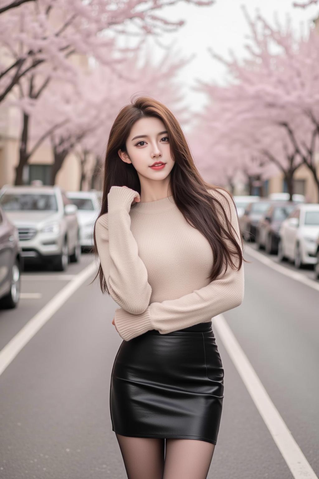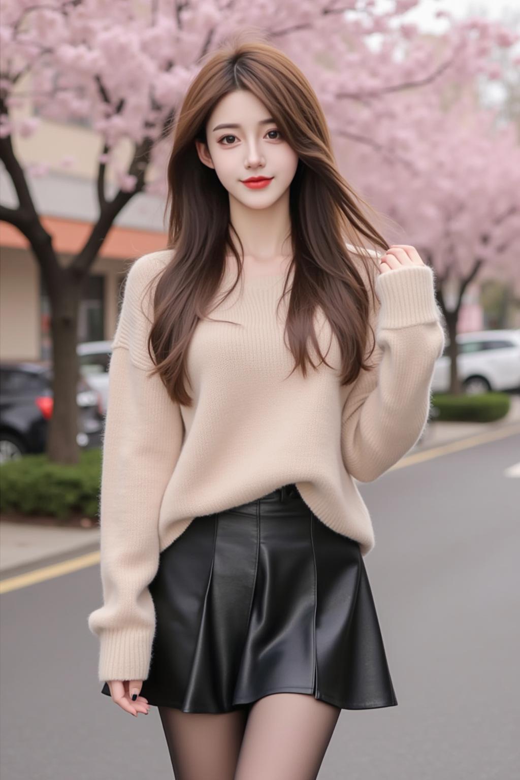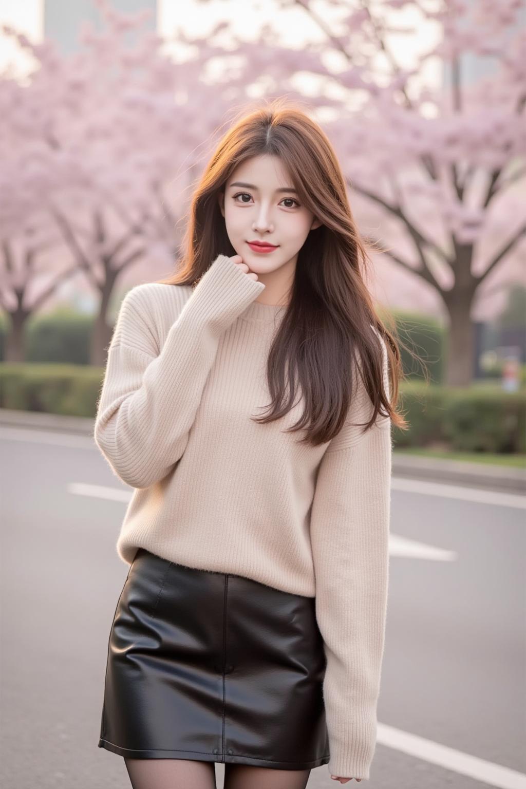 樱花树下,甜美少女,温柔穿搭,春日气息。