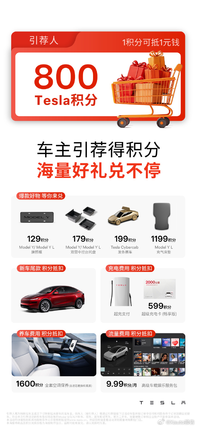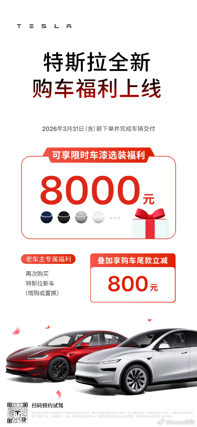 特斯拉推出限时购车福利,3月31日前下订并提车可享8000元车漆选装福利,老车主复购可叠加800元尾款立减。同时可成为引荐官,成功推荐好友得800积分,可抵扣充电、尾款、养车费用或兑换好物。新能源汽车特斯拉再推限时优惠特斯拉