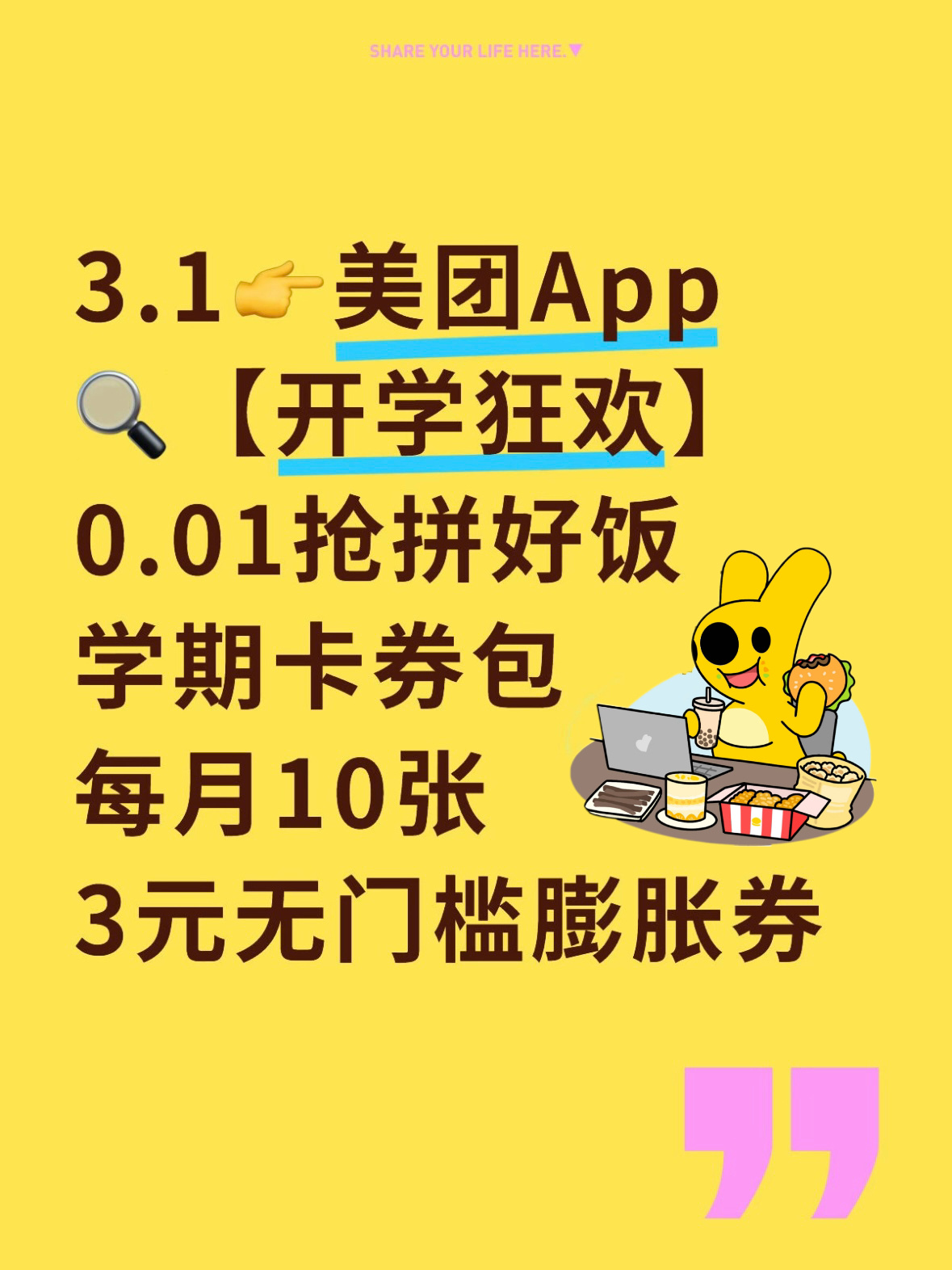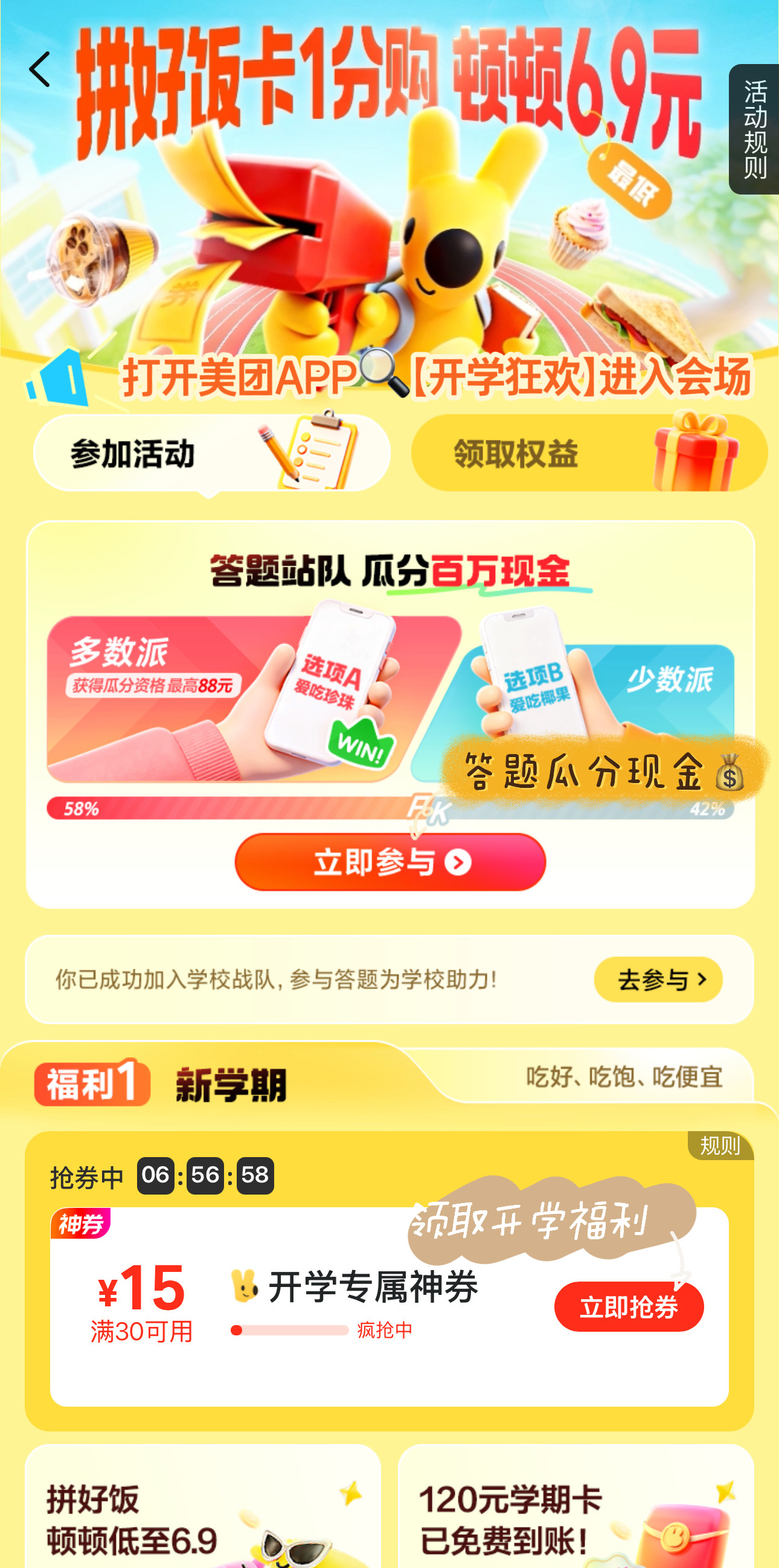 开学容错率最高的三个决定作为合格的“水系”大学生,我宣布这周容错率最高的瞬间,就是我在美团发现自己属于“多数派”3月6日起上美团/美团外卖App搜“开学狂欢”参加战队游戏,顺着大家选就能瓜分100万,连对3题还有88元现金红包机会加上3月1日就能抢的0.01元学期卡,每月送10张3元无门槛膨胀券领足4个月 ,配合6.9元起大牌美食爽吃的拼好饭,这周伙食费简直被承包了这种不费脑子只拼默契的感觉谁懂啊!